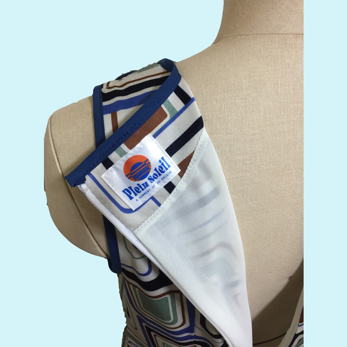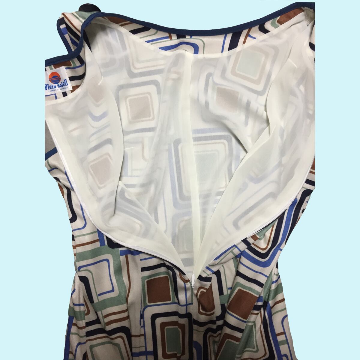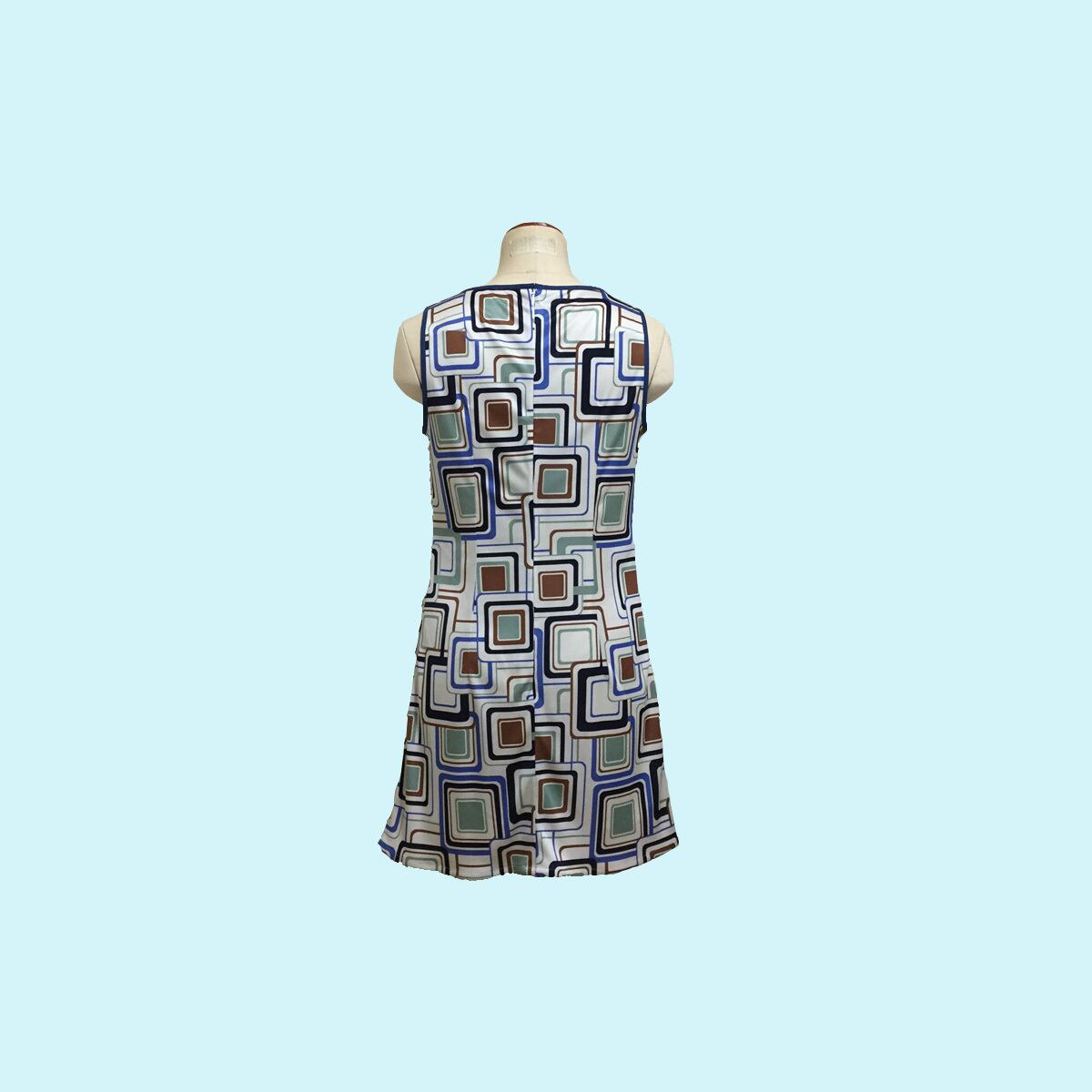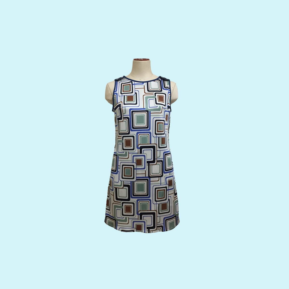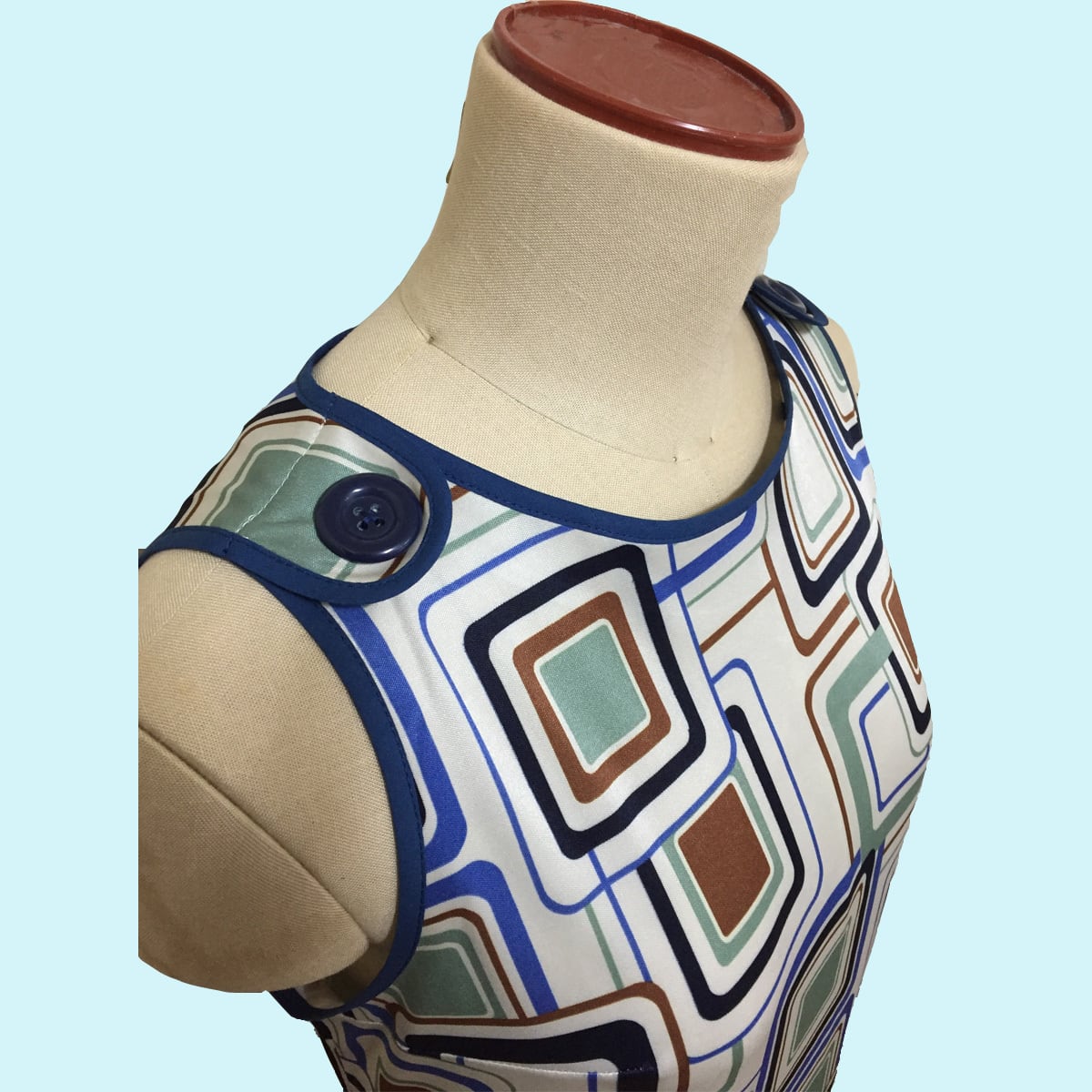 ノーカラーノースリーブが60sテイストの幾何学柄ワンピースです。