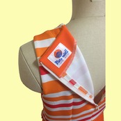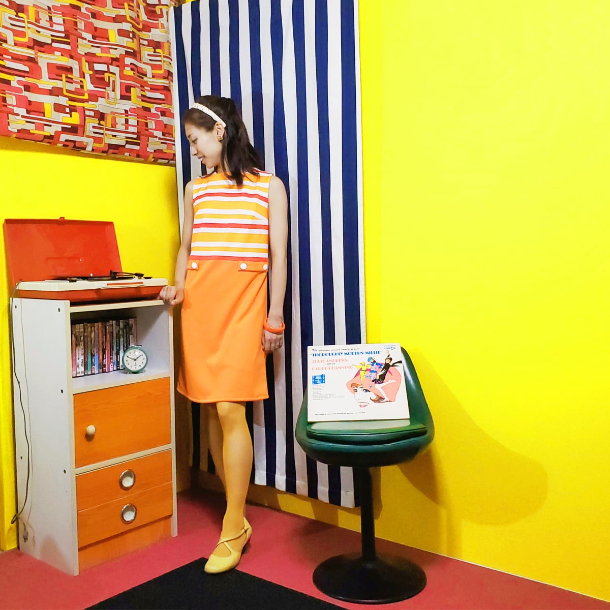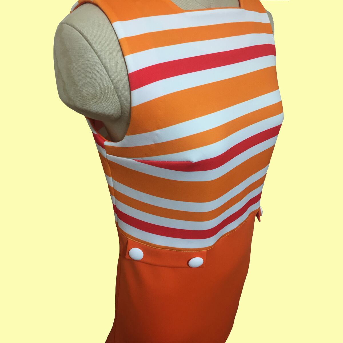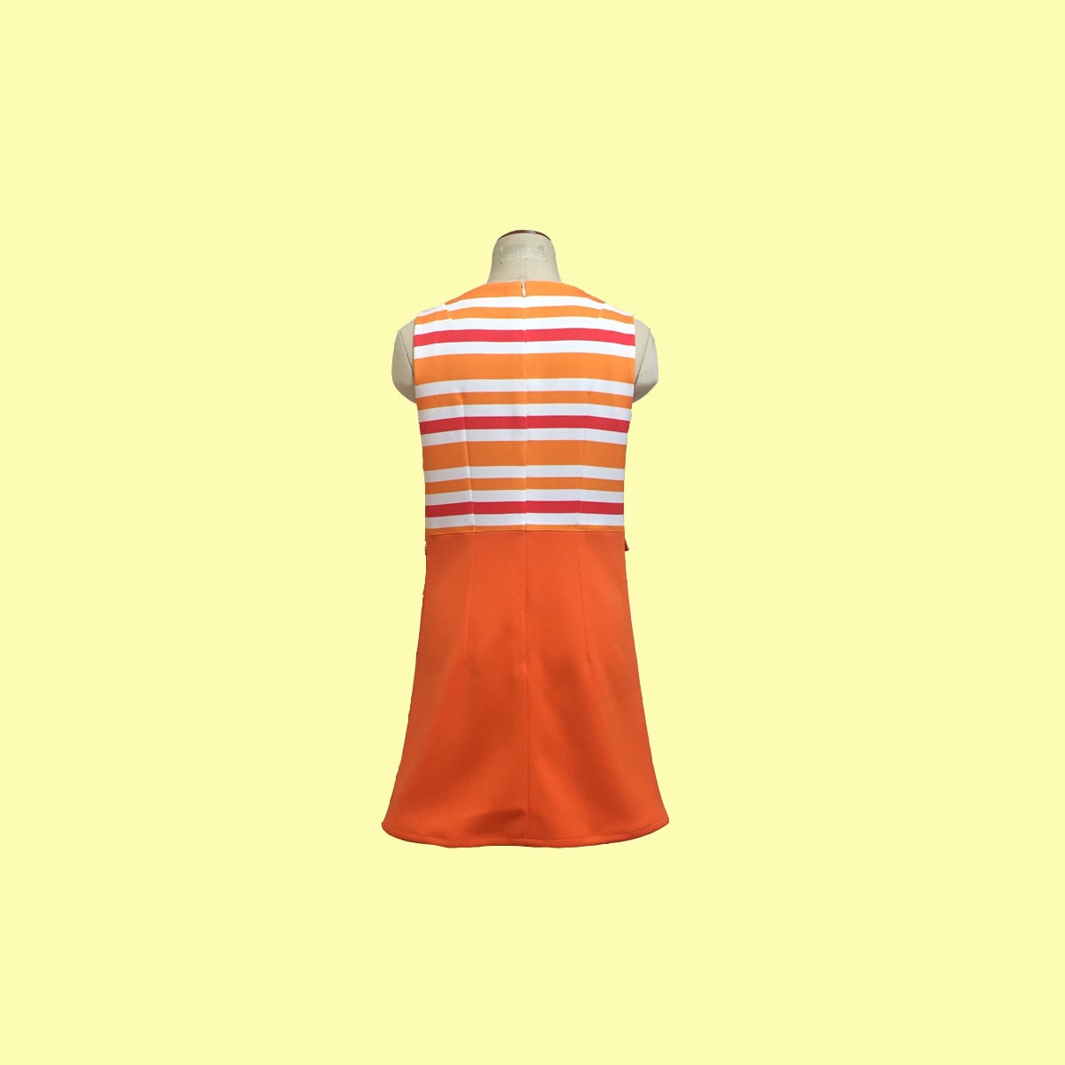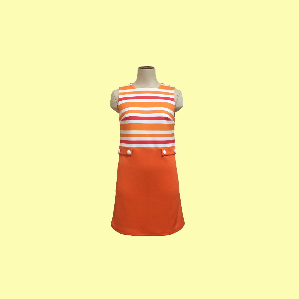 後ろ開きノースリーブ、シンプルなシルエットですが、60sテイストのインパクト大のボーダー、オレンジの切り替えがポイント。