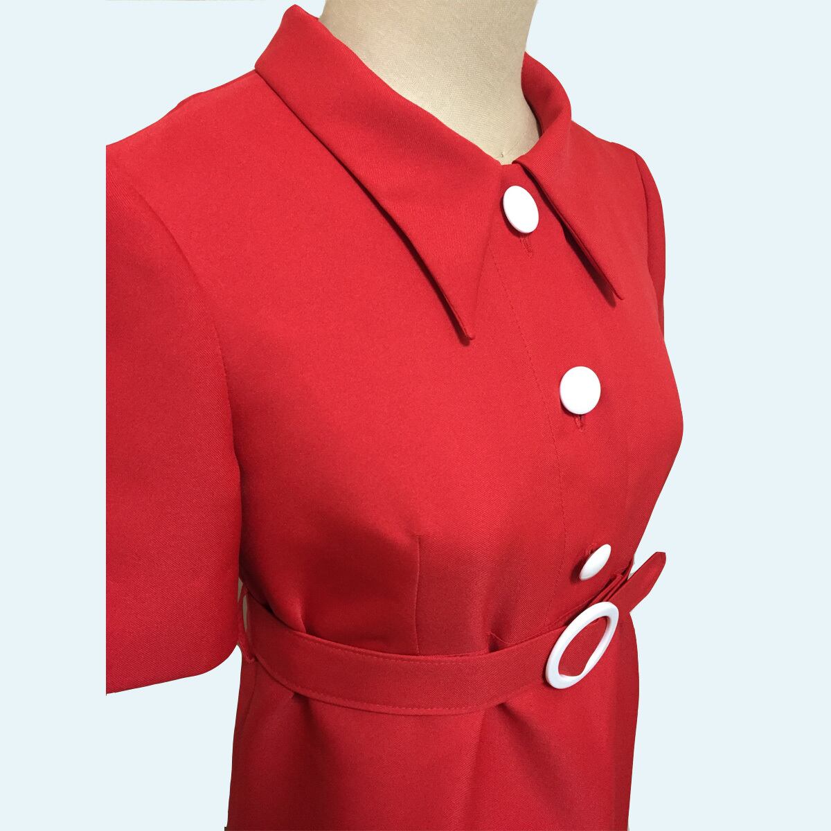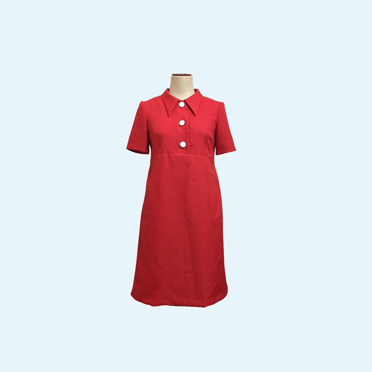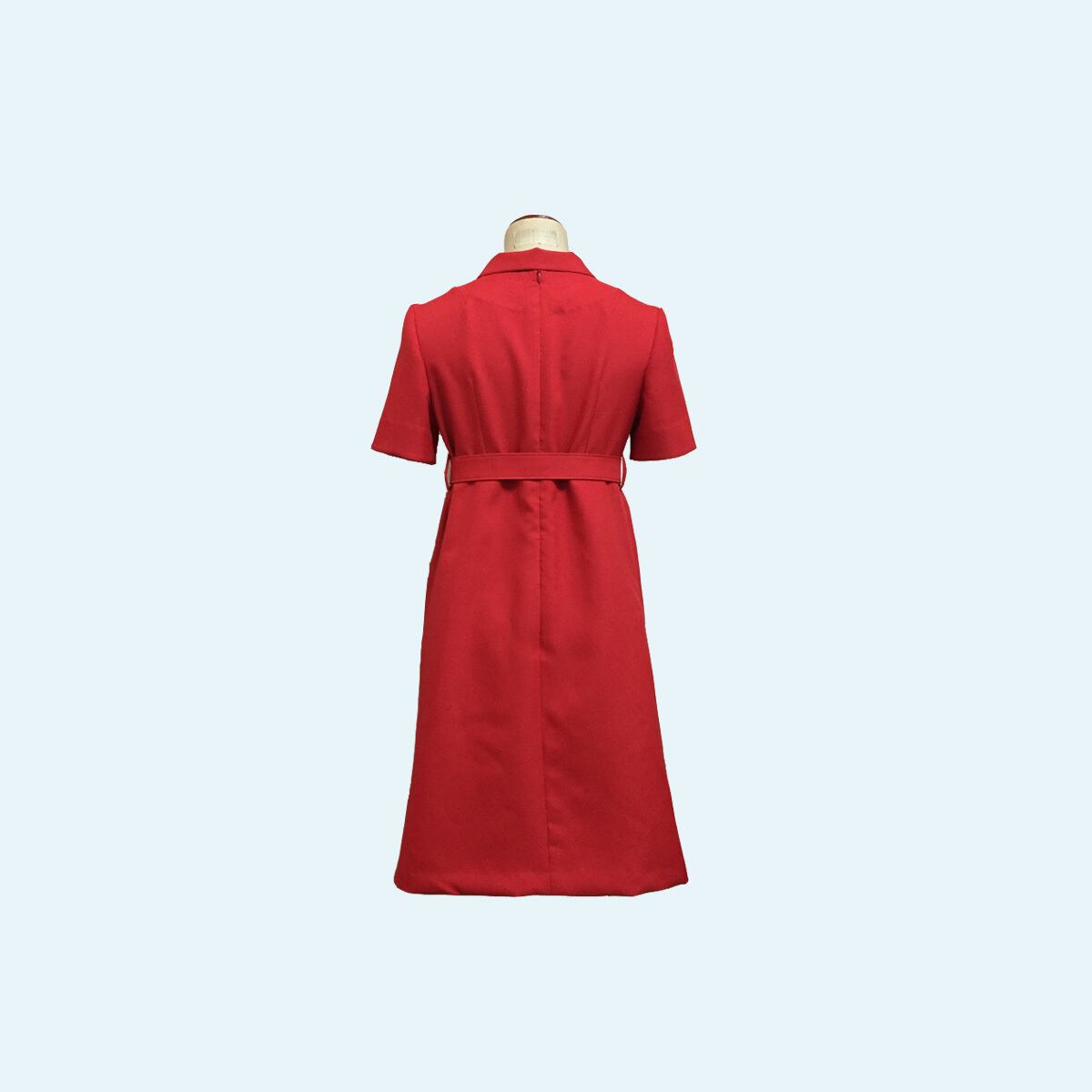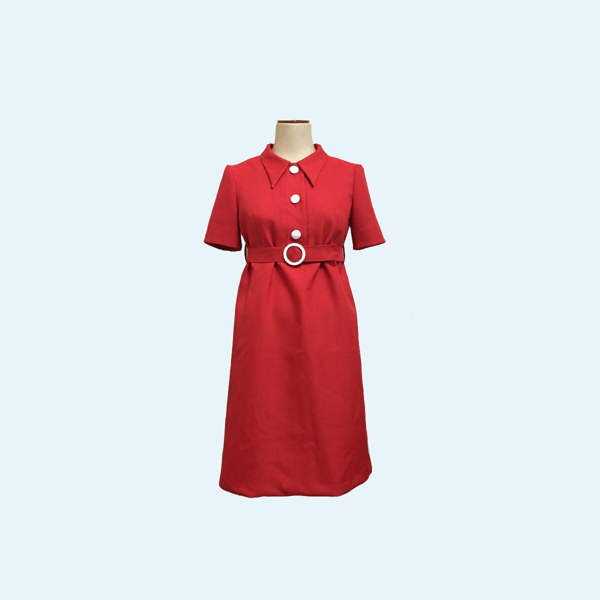 大きめの衿、ボタン開き、ベルトがレトロデザインなワンピースです。