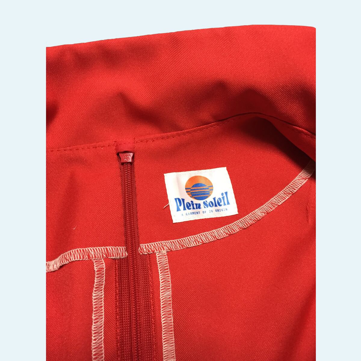 レッドに映えるホワイトのボタン、バックルがポイントです。