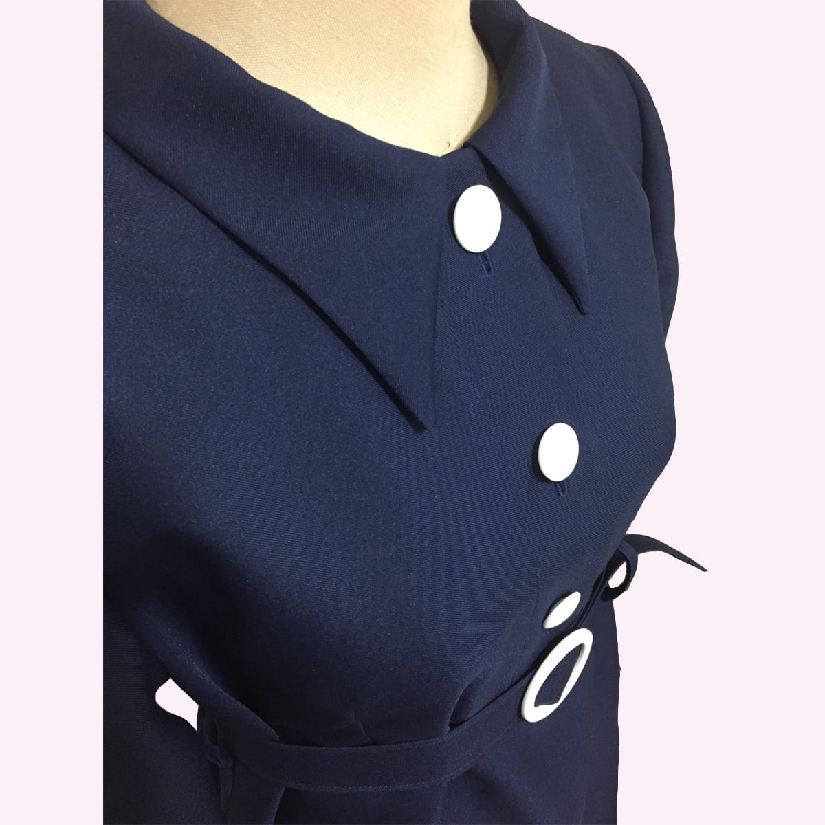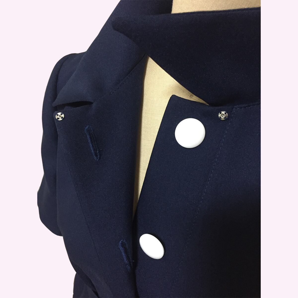 ネイビーに映えるホワイトのボタン、バックルがポイントです。