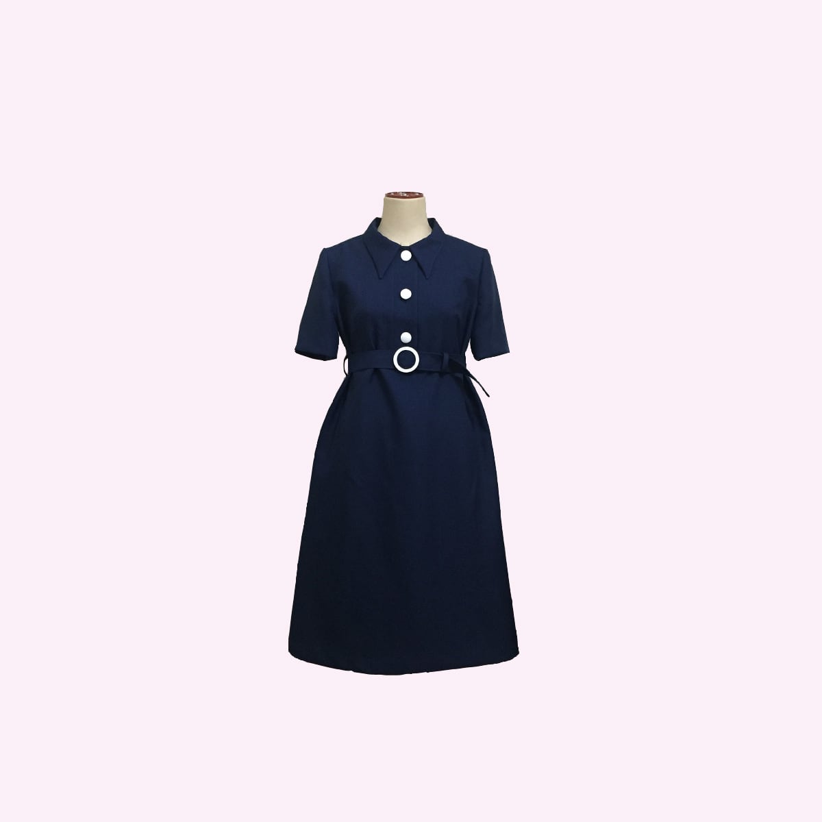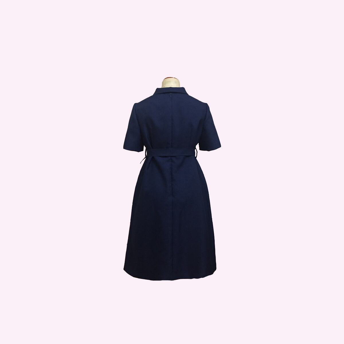 大きめの衿、ボタン開き、ベルトがレトロデザインなワンピースです。