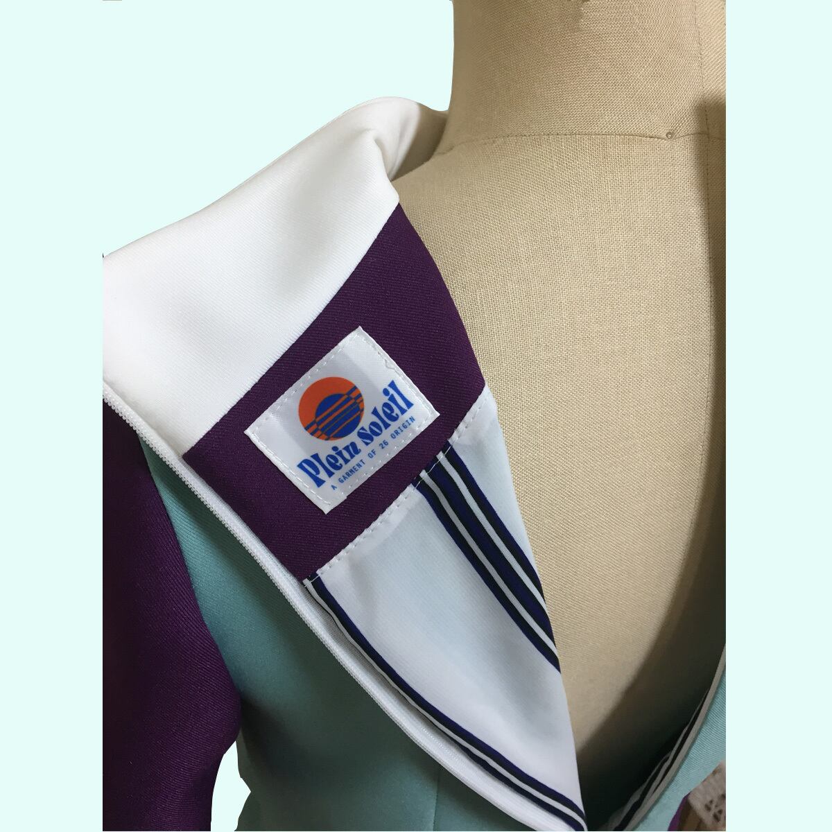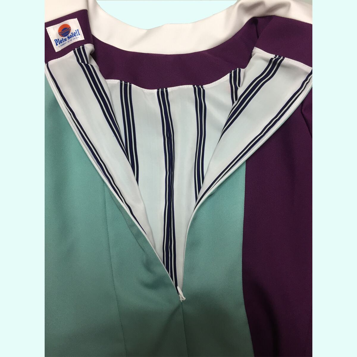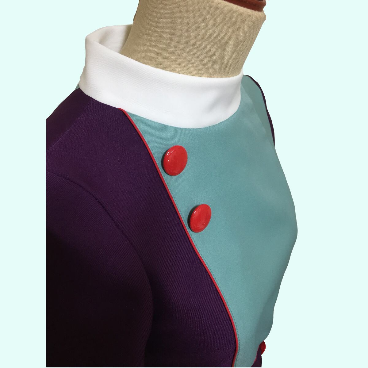 ポリエステルのメイン素材の2色使い切り替えに衿、ボタンのホワイトがアクセントとなっています。
