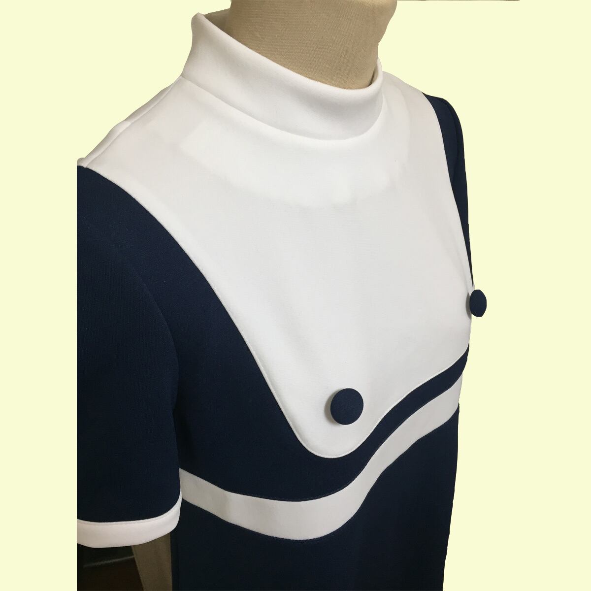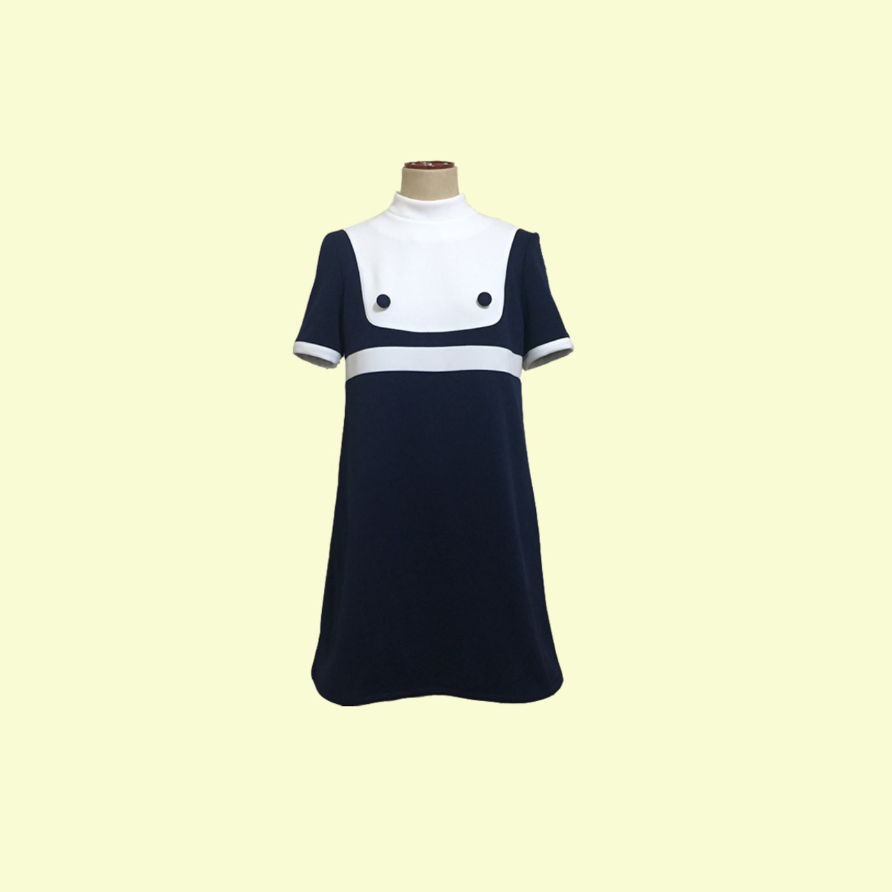 後ろ開きハーフスリーブ、60sチックなカラーブロックデザインのワンピース。