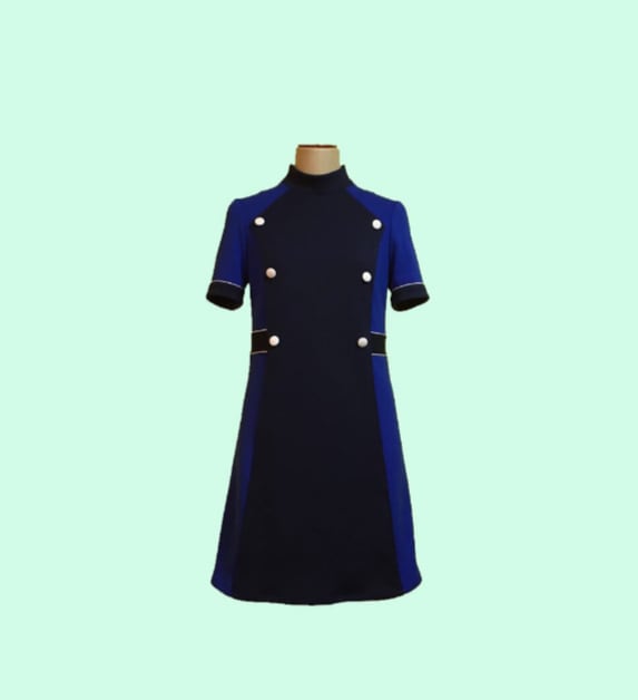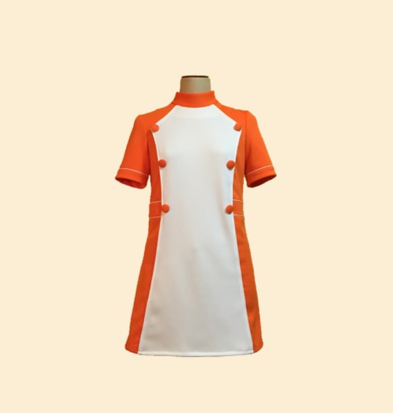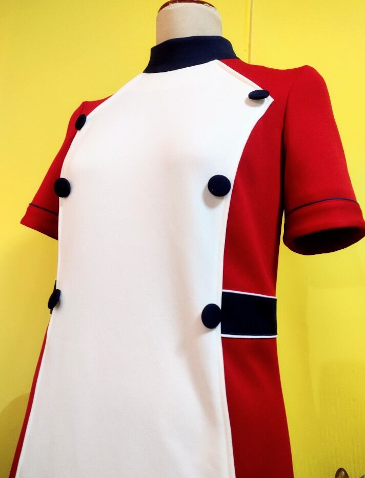 フロントの飾りボタンとベルト袖口のパイピングがデザインポイント。