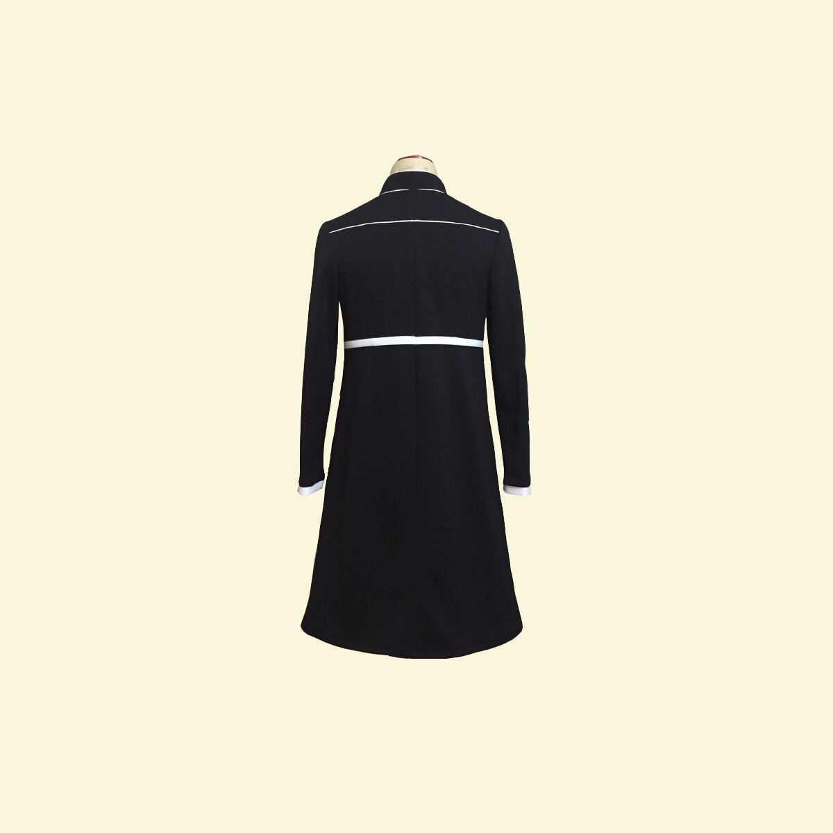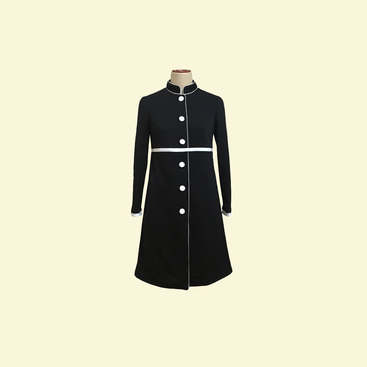 前開きロングスリーブ、ハイウエスト切り替えデザインの袖付きスタンドカラーワンピースになります。
