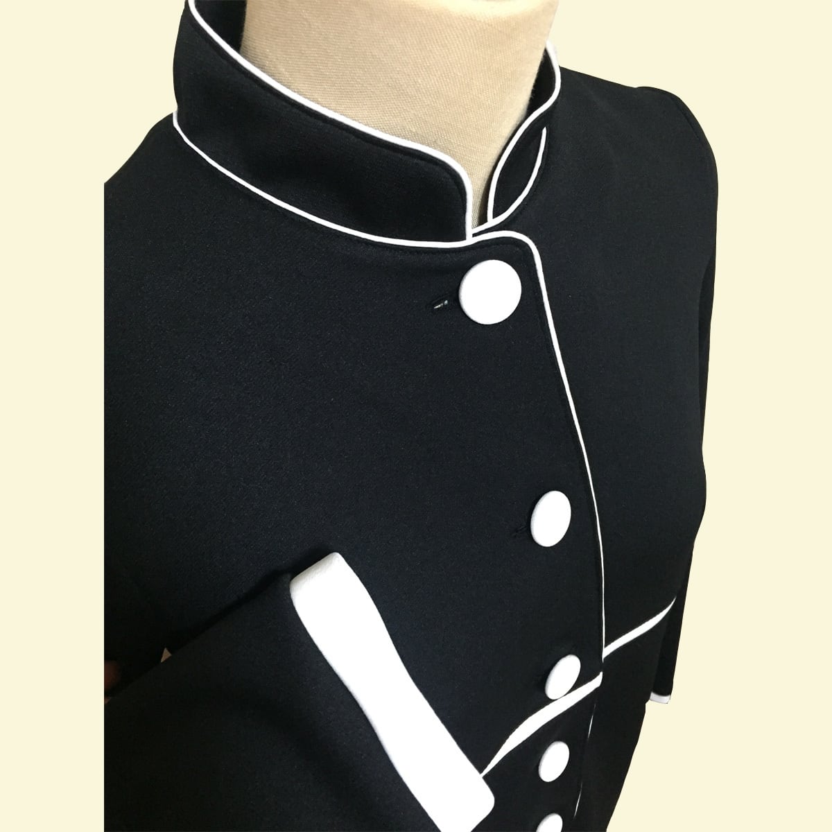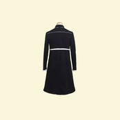 ハイウエストでのベルト配色切り替え、カラースイッチボタン、また袖口、パイピングの配色使いがポイントです。