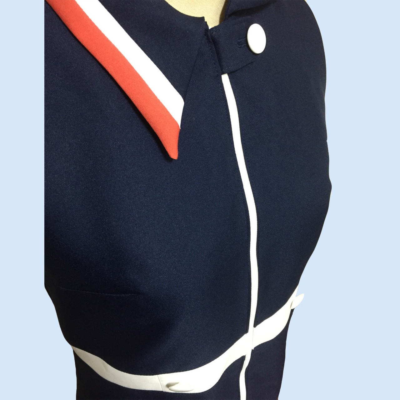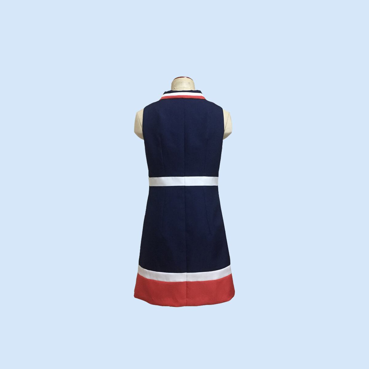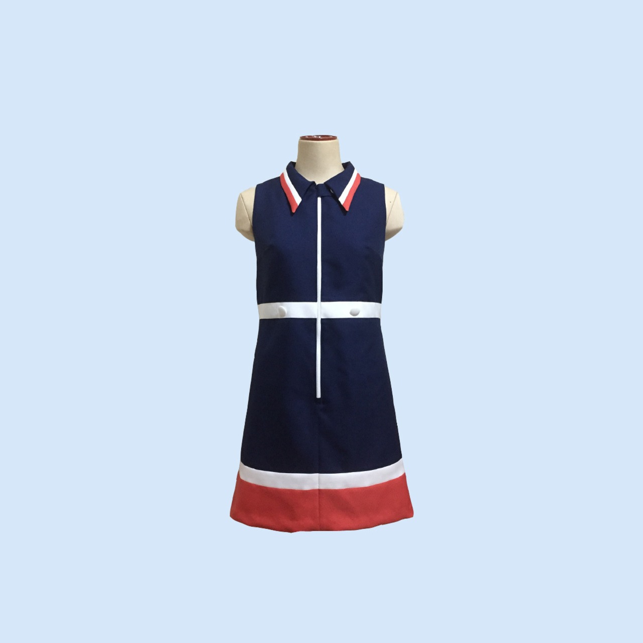 ロングポイントカラーノースリーブが60sチックなデザインのフロントジップ開きワンピースです。