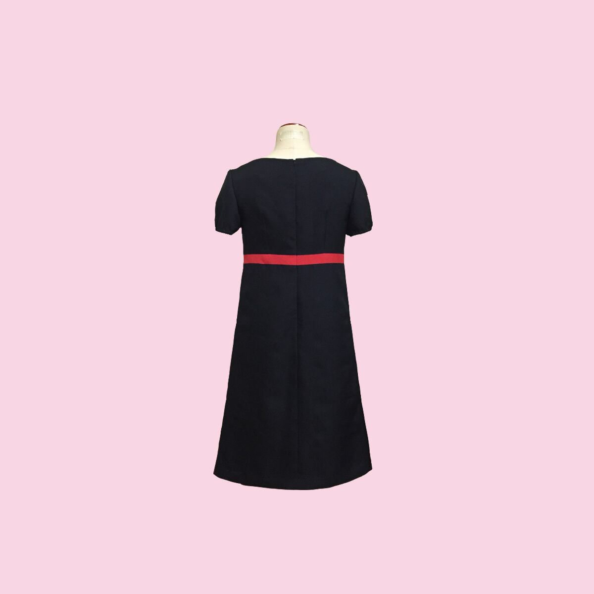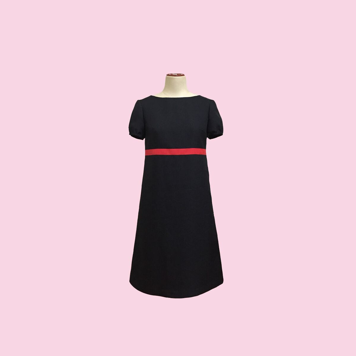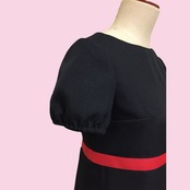 後ろ開きボートネック、パフスリーブのハイウエストAラインワンピース。