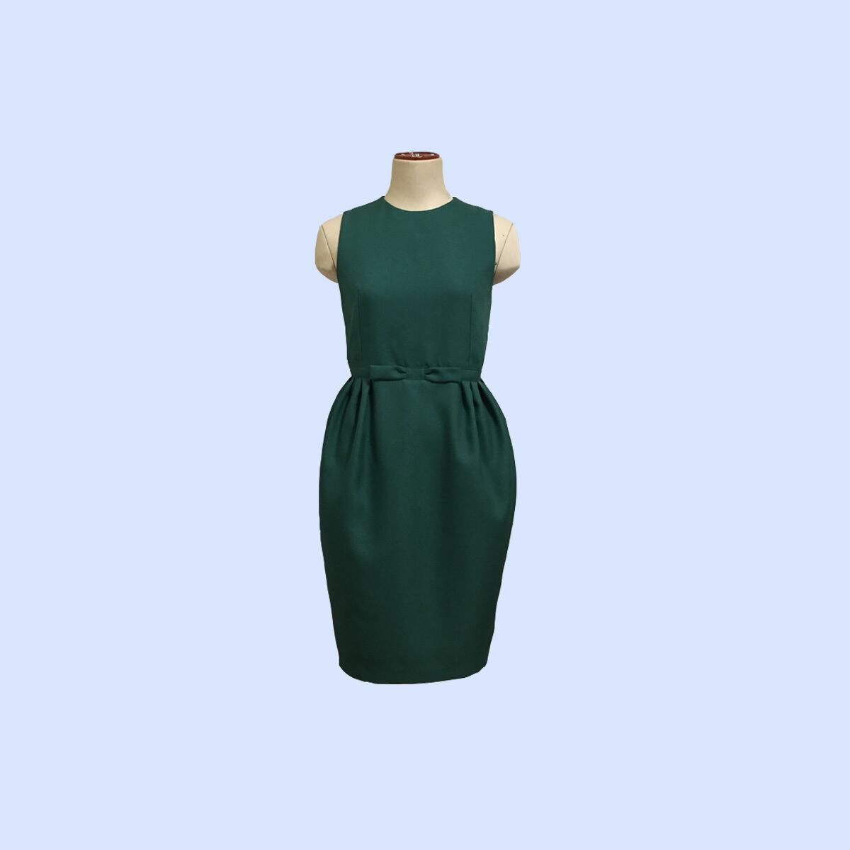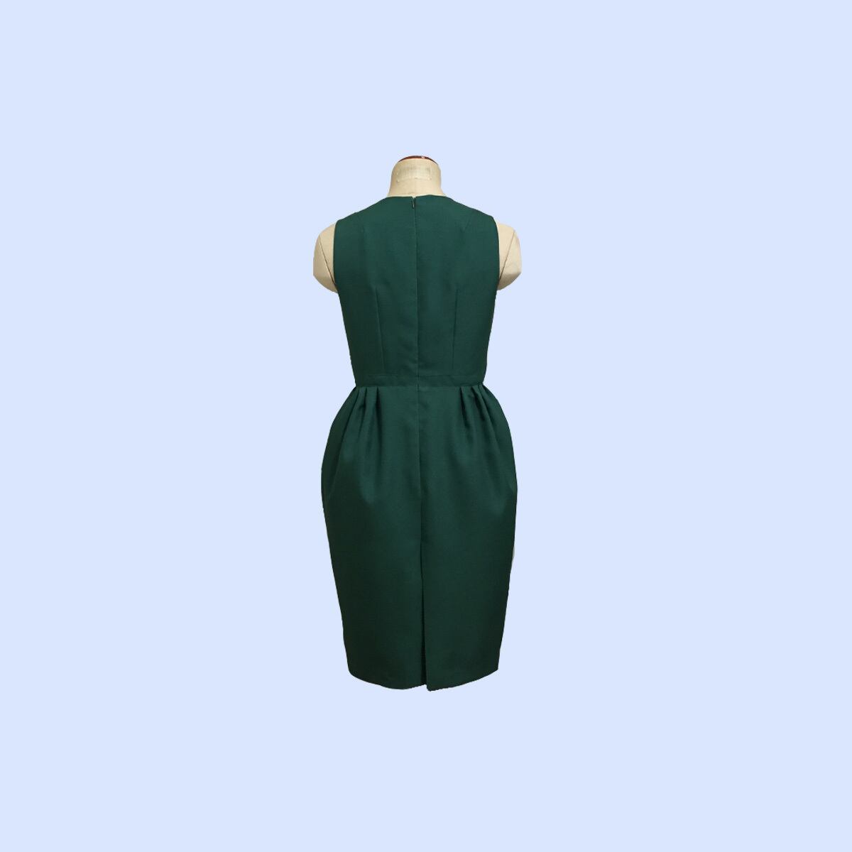 後ろ開きノースリーブ、シンプルなトップスとタック入りのバレルスカートのコンビのワンピースです。