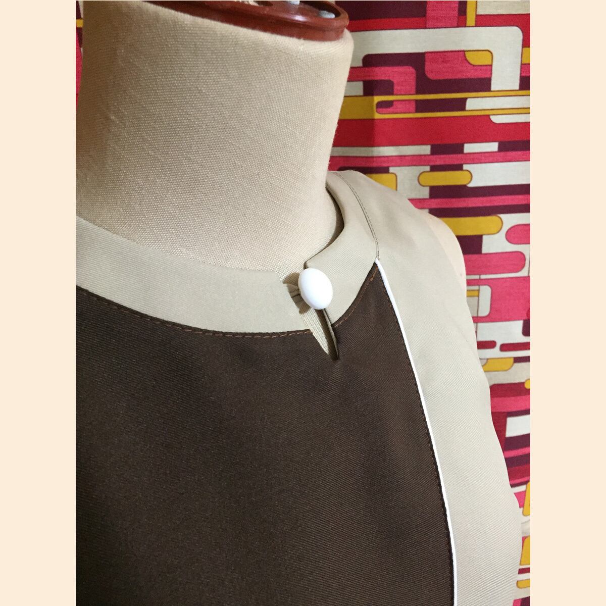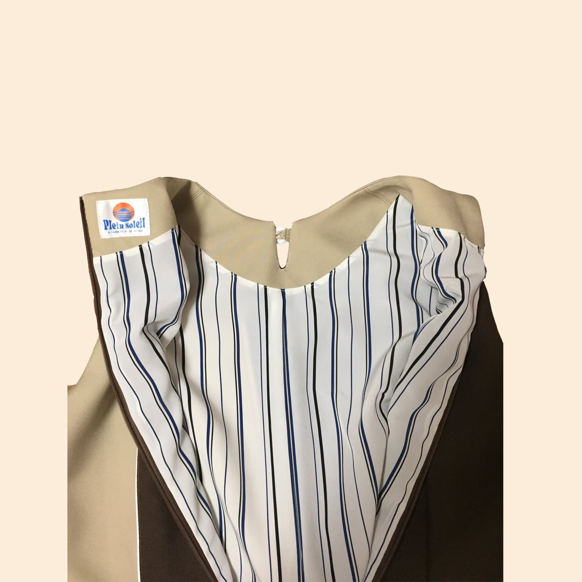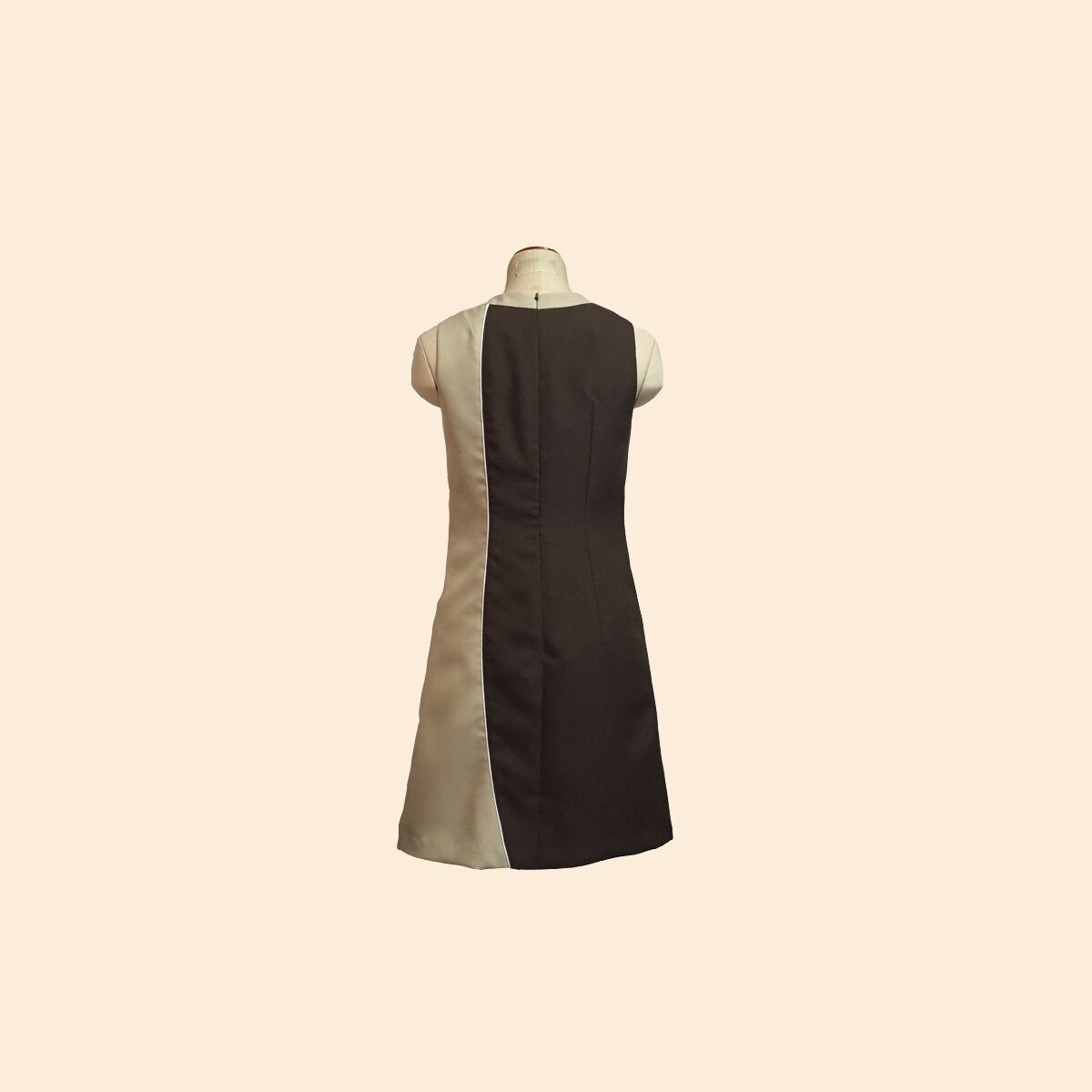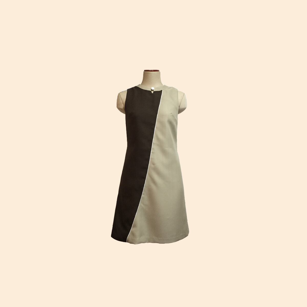 ノーカラーノースリーブ、大胆な配色切り替えが、60sチックなデザインのワンピースです。