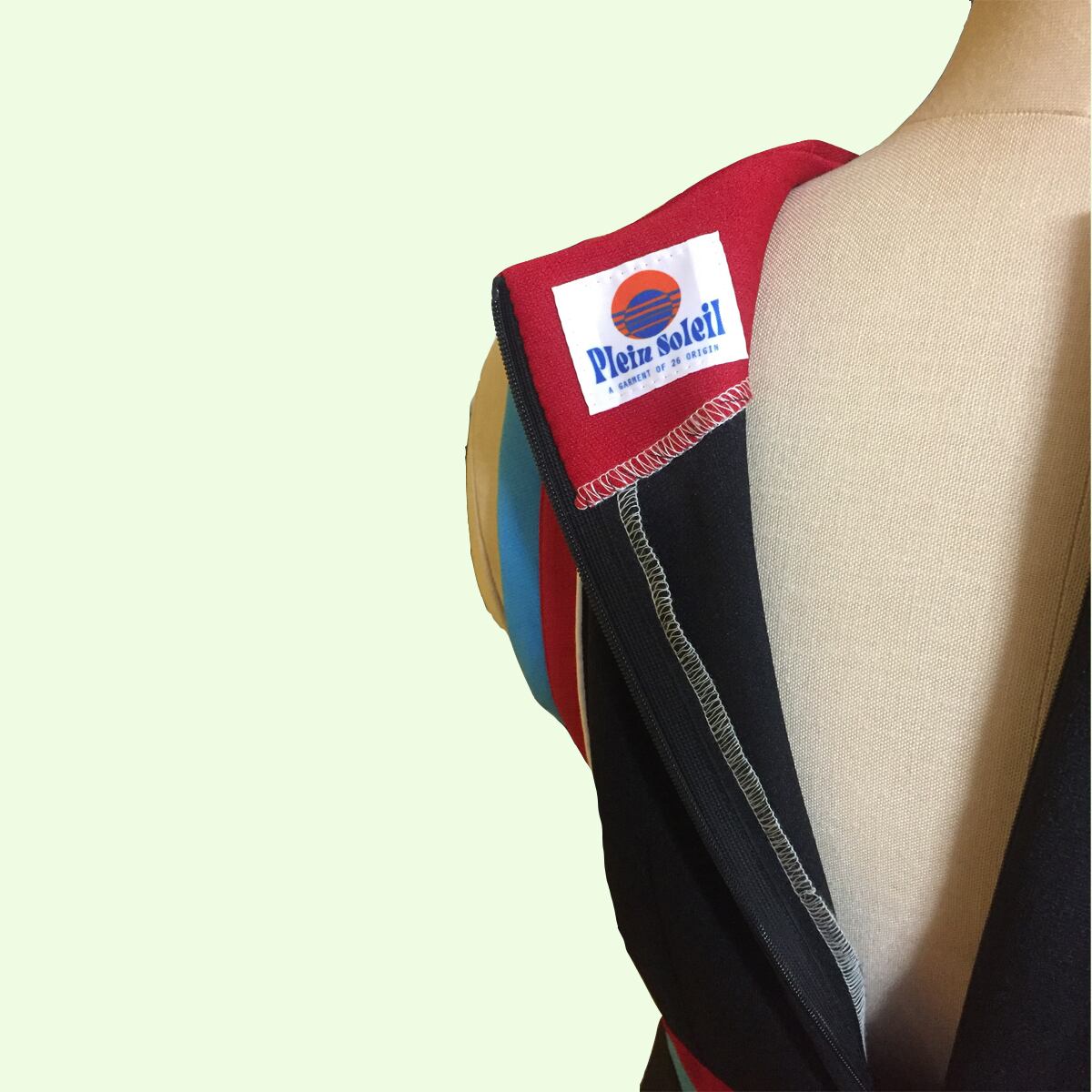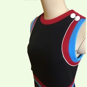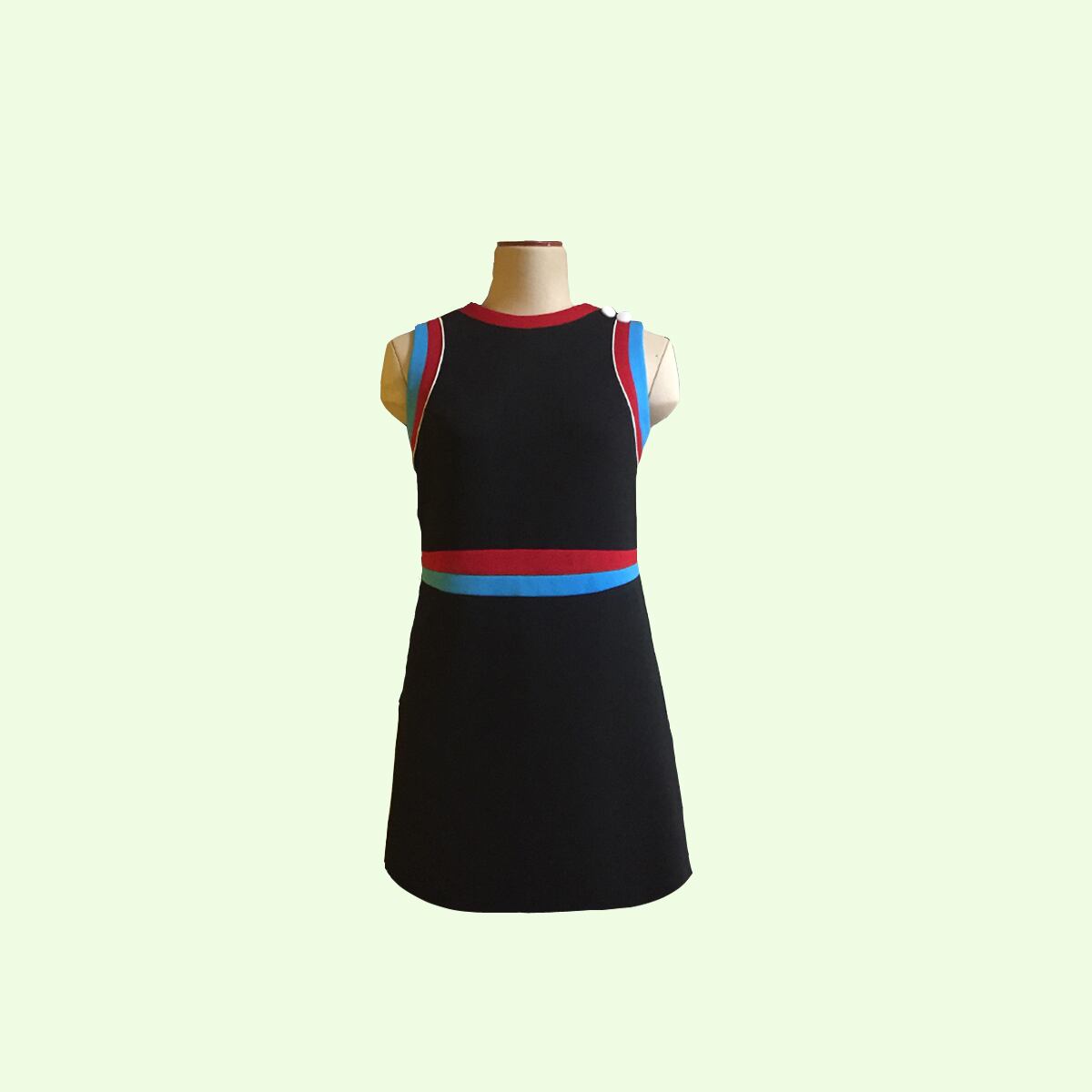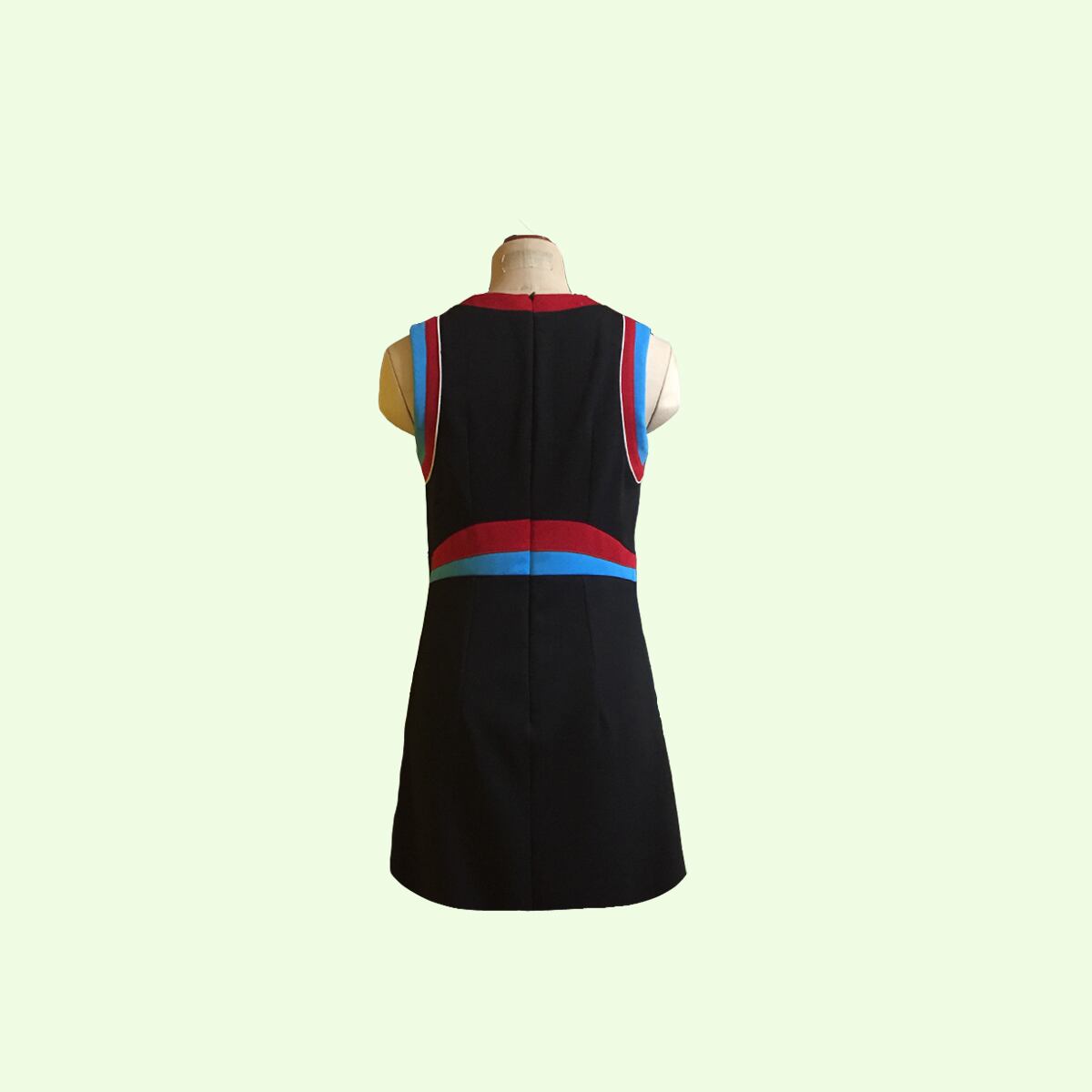後ろ開きノースリーブ、60sを想わせる大胆なカラーブロックデザインをウエスト、袖周りに配したワンピースになります。