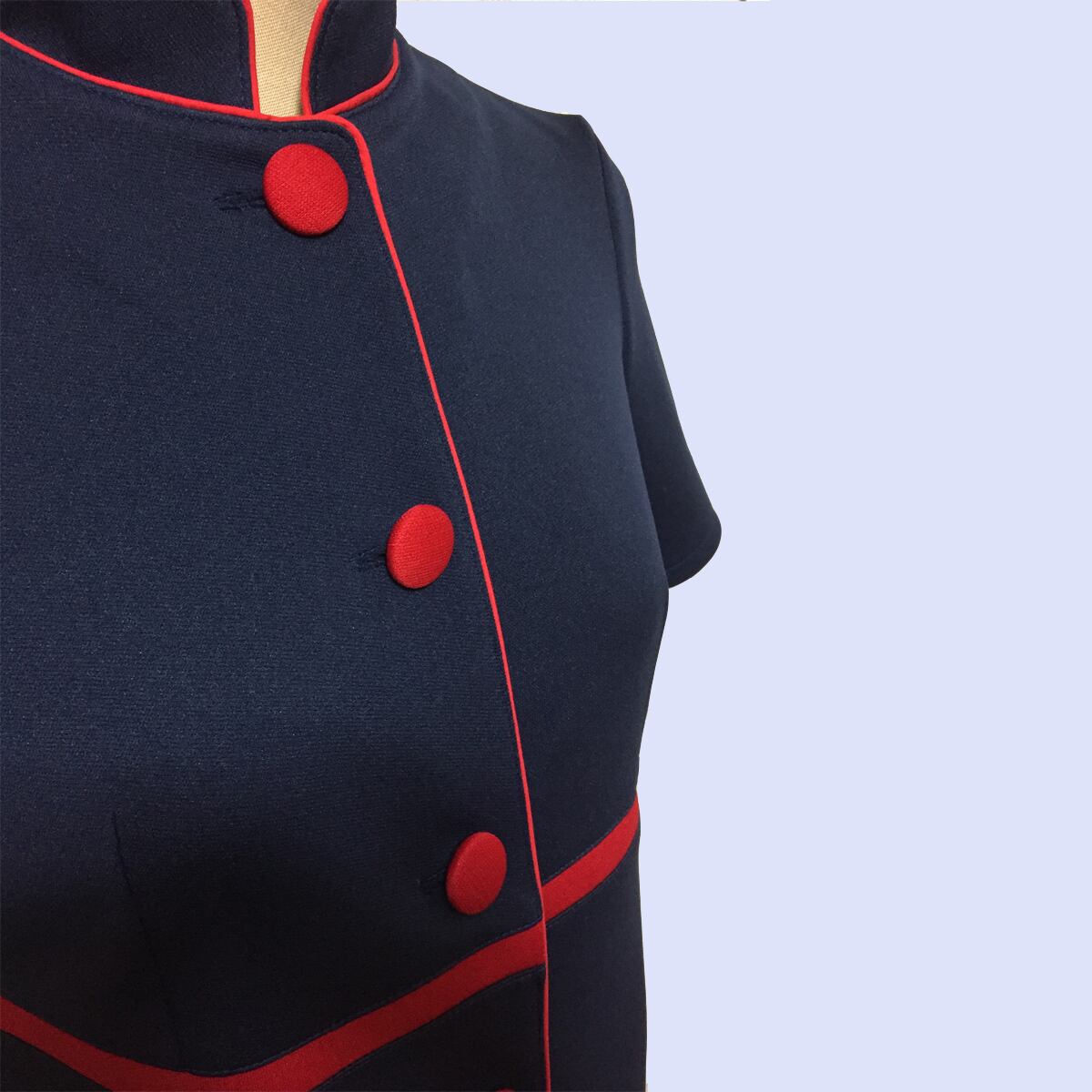 前開きハーフスリーブ、ハイウエスト切り替えデザインの袖付きスタンドカラーワンピースになります。