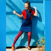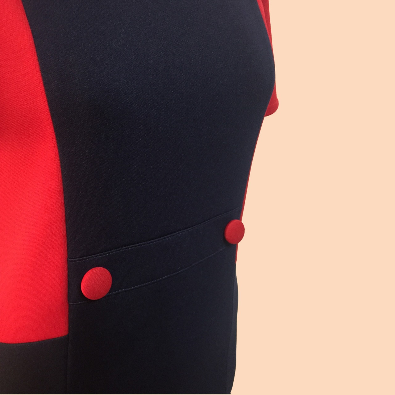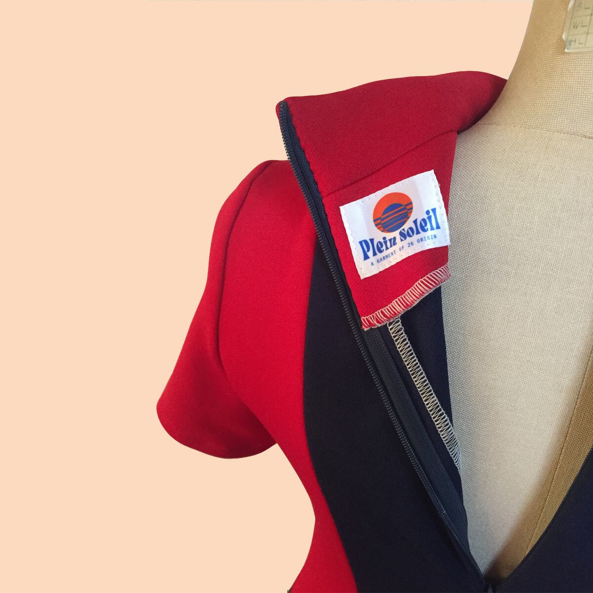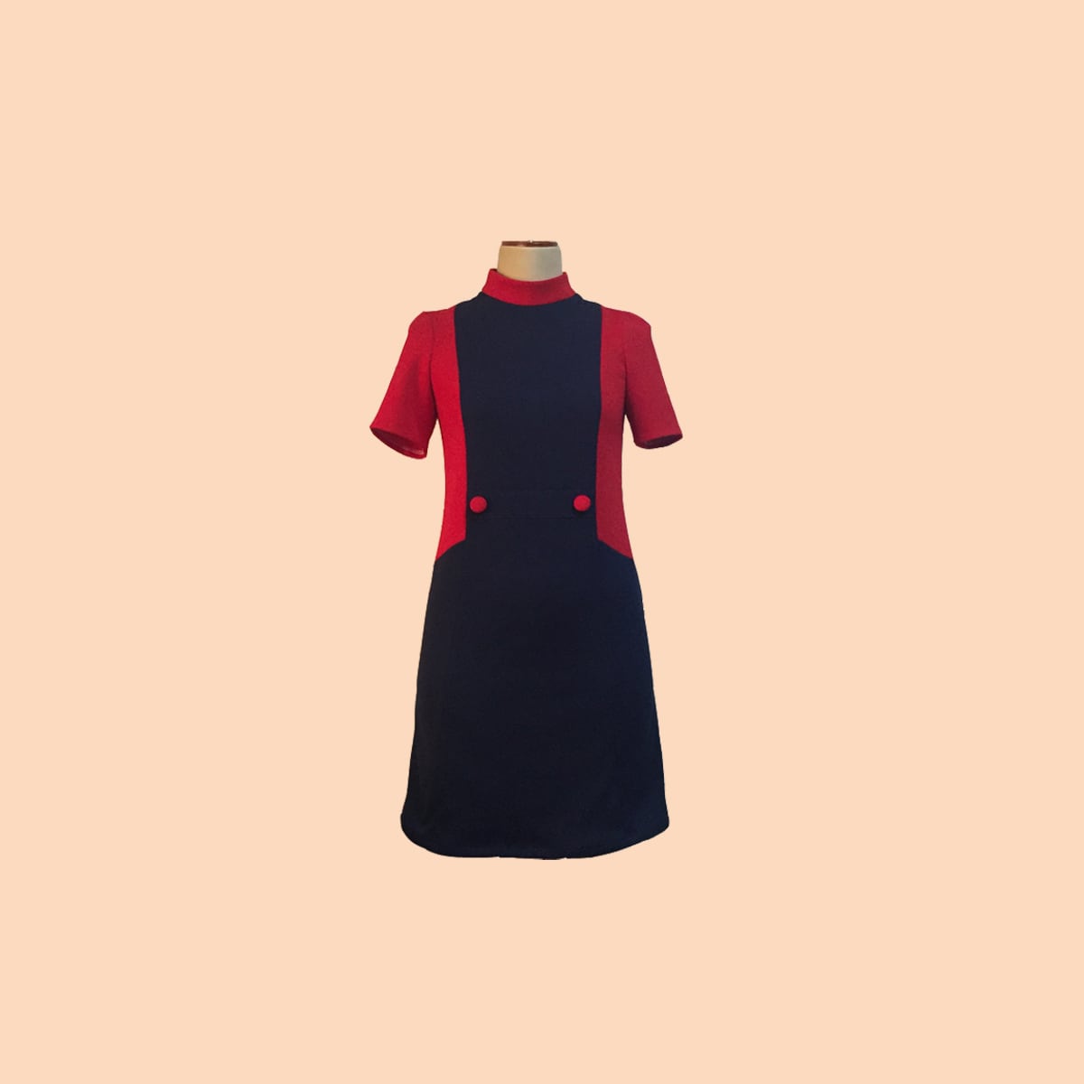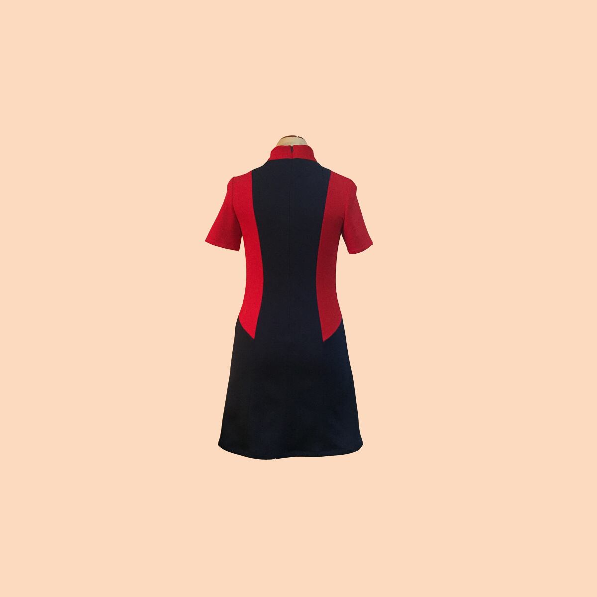 後ろ開きロングスリーブ、60sライクな大胆なカラーブロックデザインの袖付きハイネックワンピースになります。