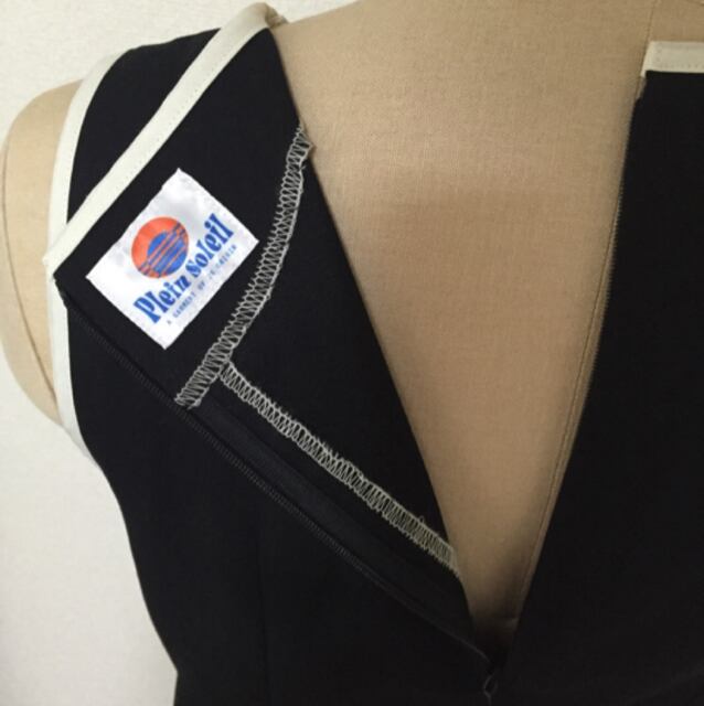 ノーカラーノースリーブが70sチックなデザインのソリッドカラーワンピースです。