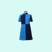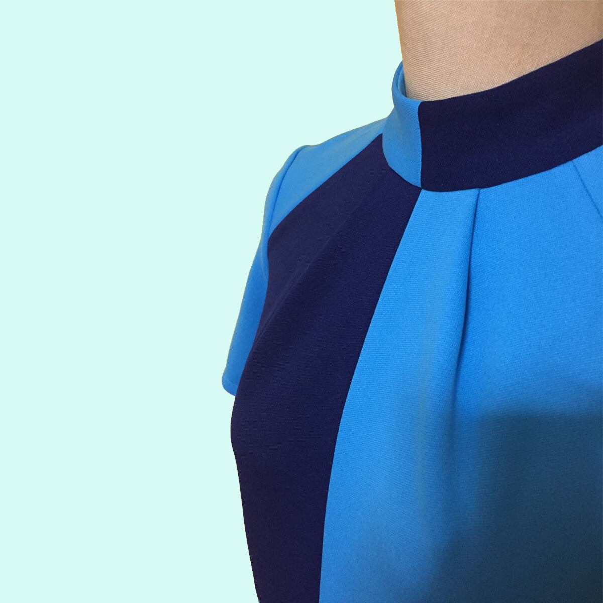 後ろ開きハイネック、アシンメトリー切り替えのワンピース。