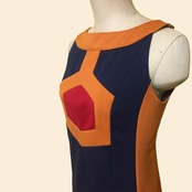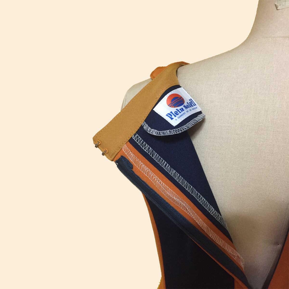 切り替えによる幾何学モチーフを胸元に大胆にあしらったデザインがポイントです。