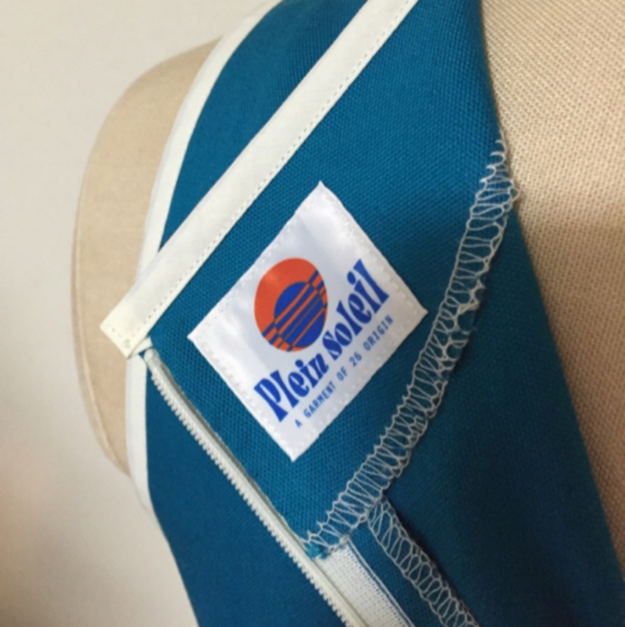 ターコイズブルーのメイン素材にホワイトのパイピングがアクセントとなっています。