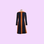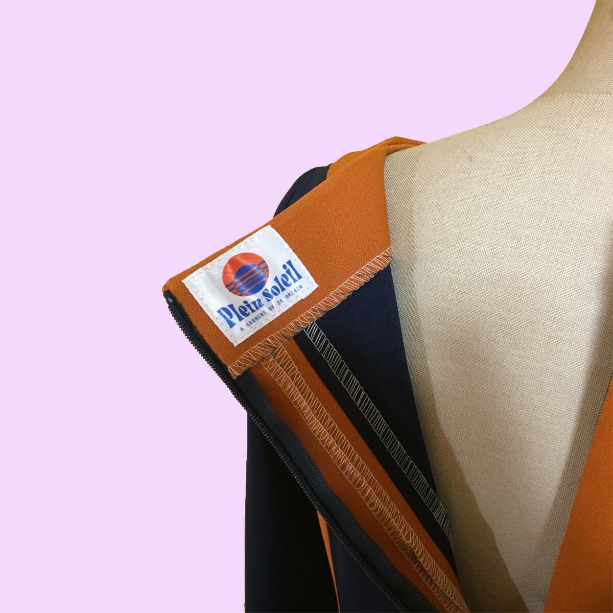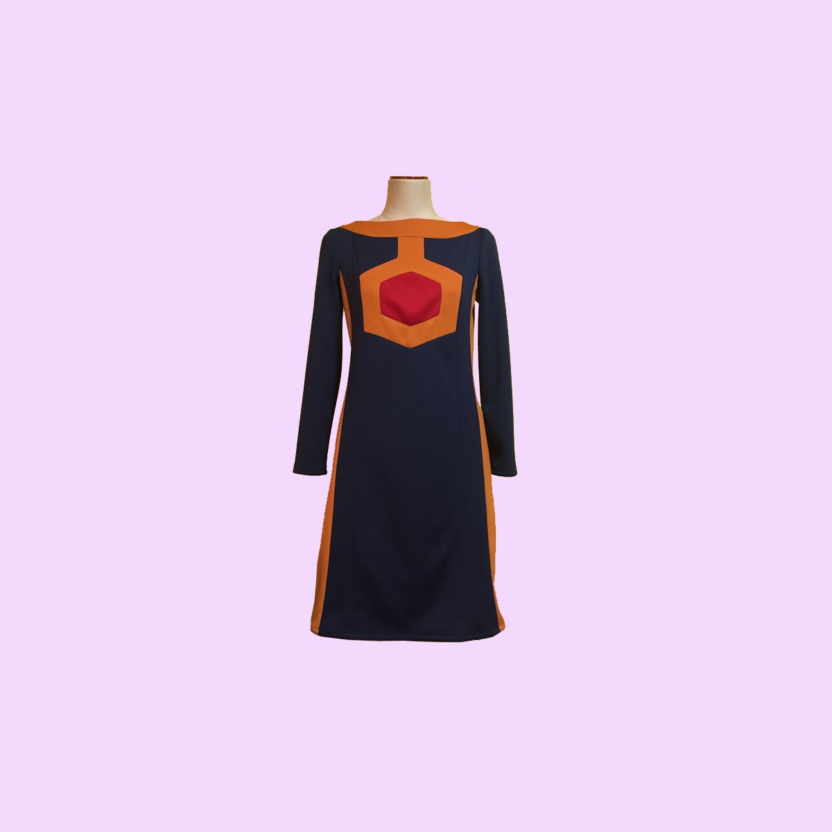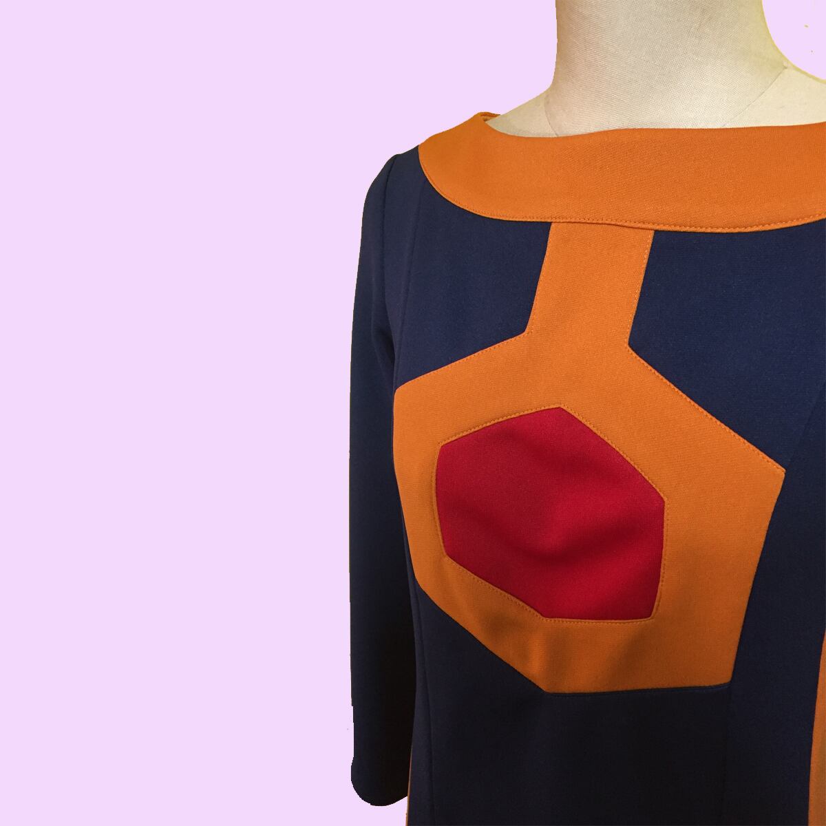 切り替えによる幾何学モチーフを胸元に大胆にあしらった60sテイストなデザインがポイントです。