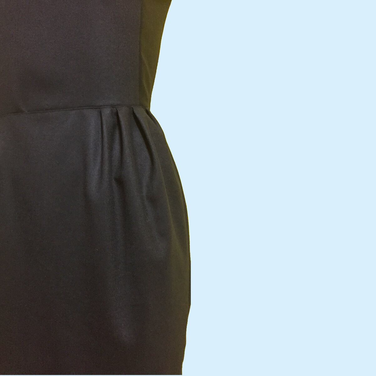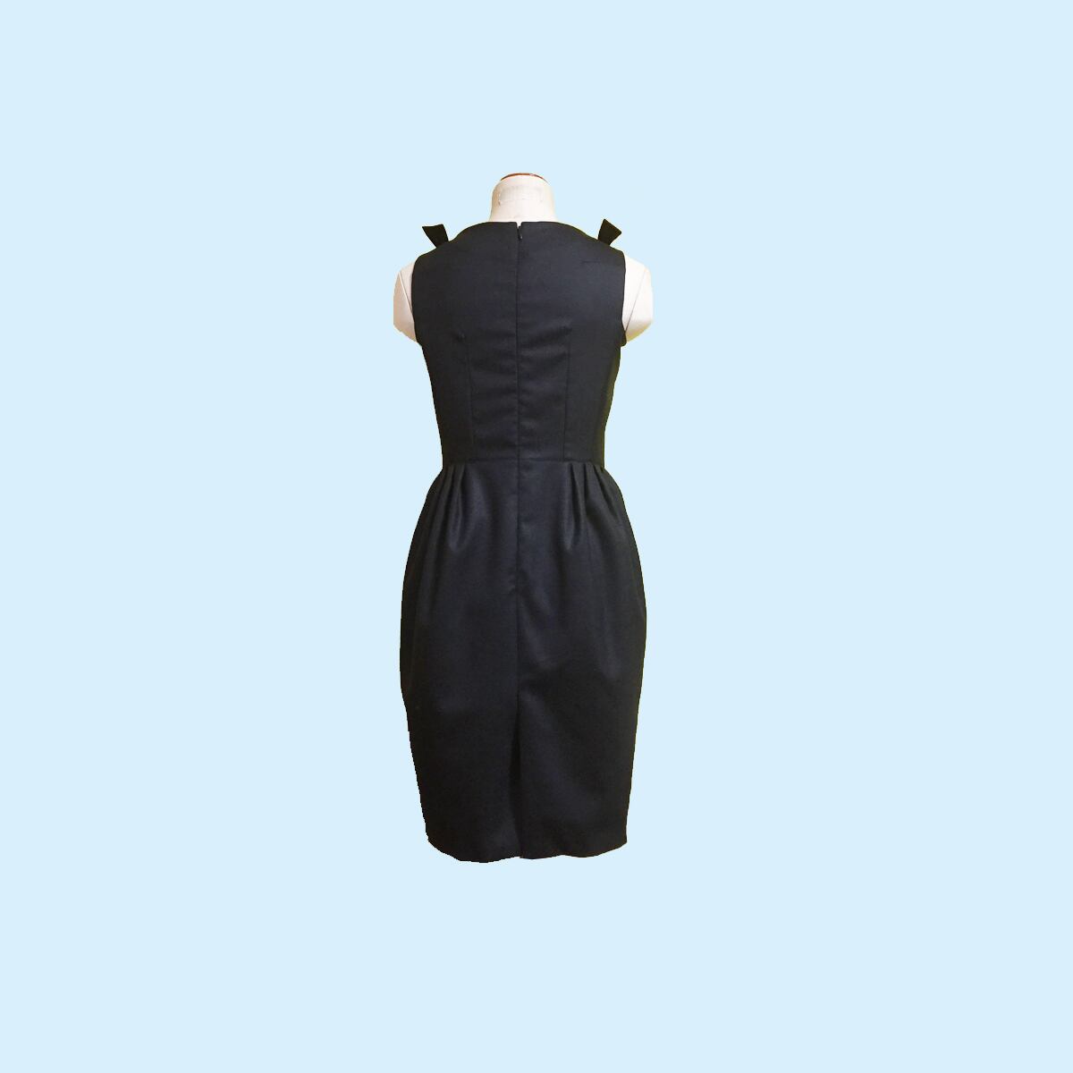 後ろ開きノースリーブ、シンプルなトップスとタック入りのバレルスカートのコンビのワンピースです。