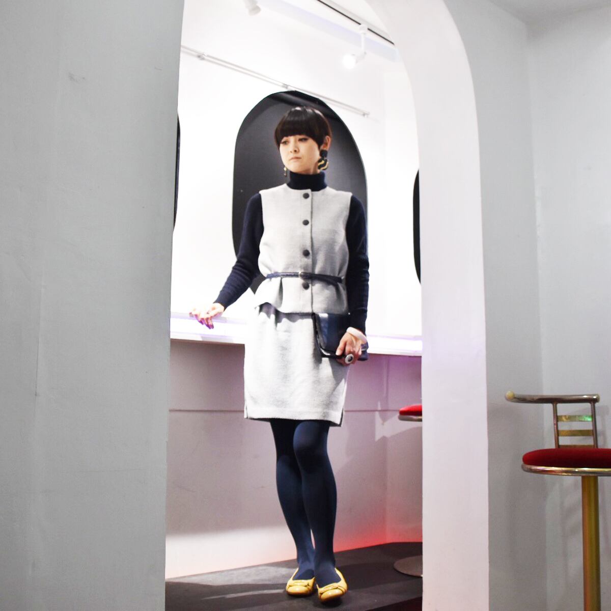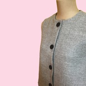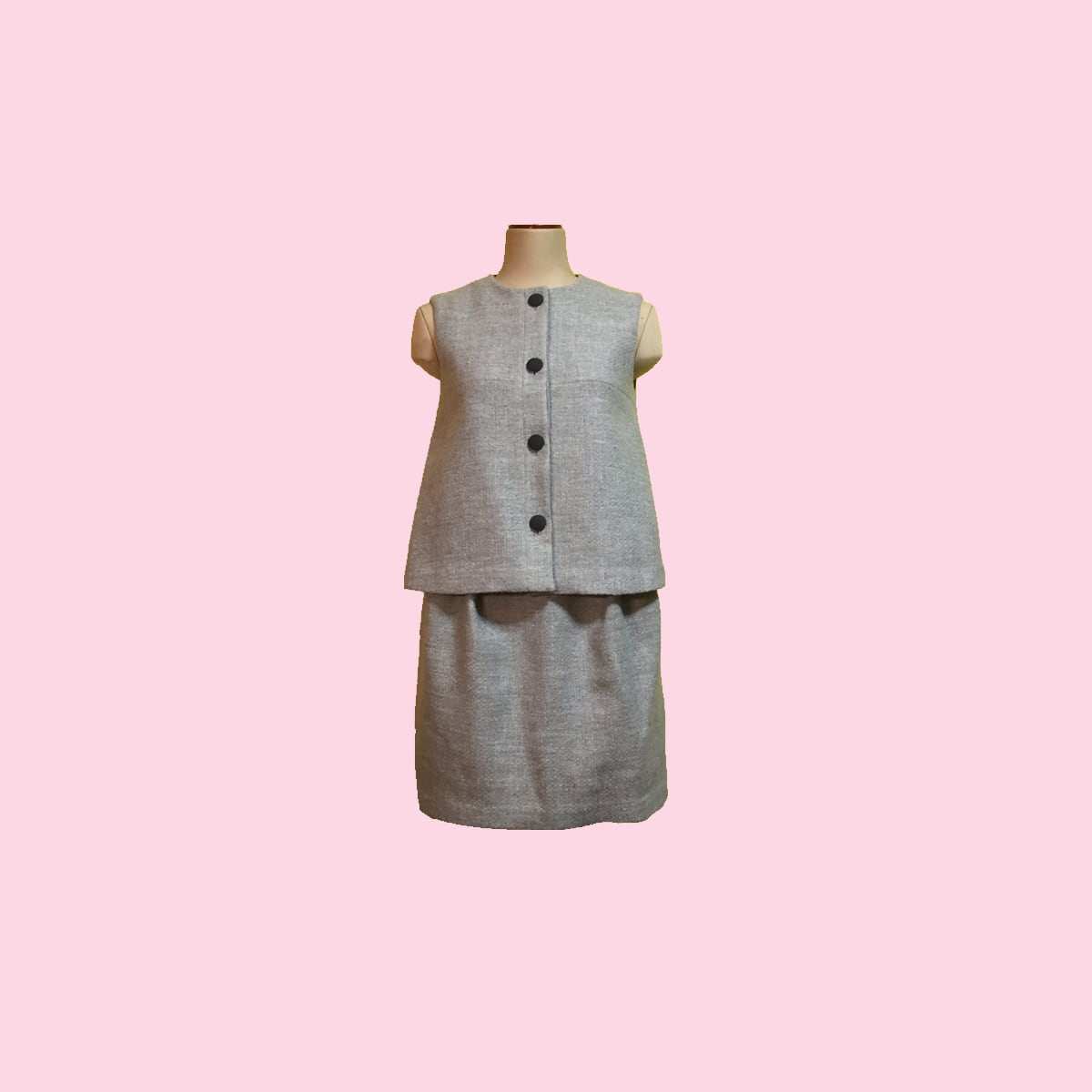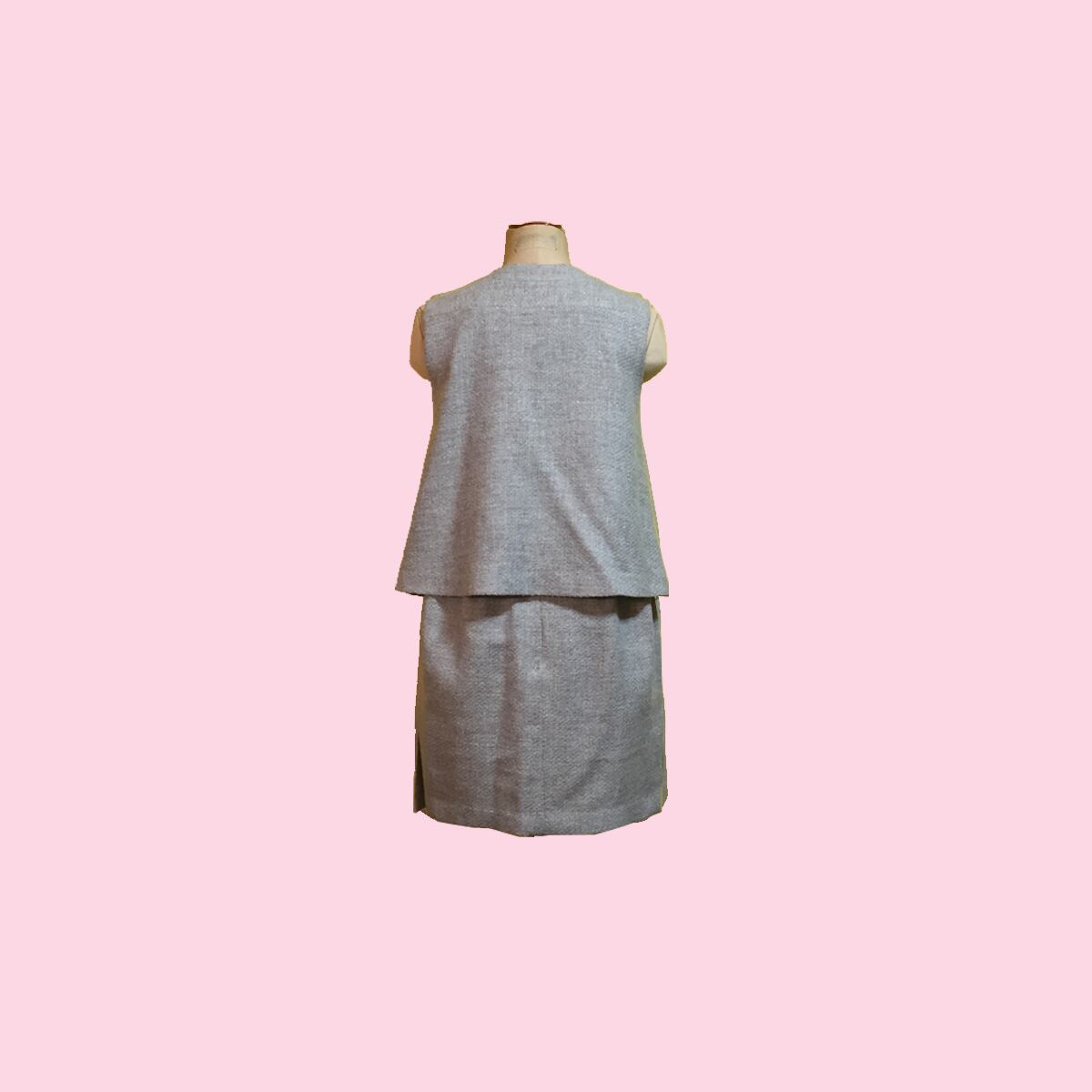 レトロなノースリーブジャケットとタックスカートのアンサンブル。