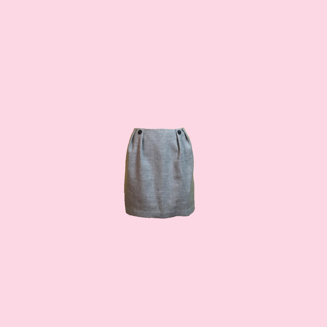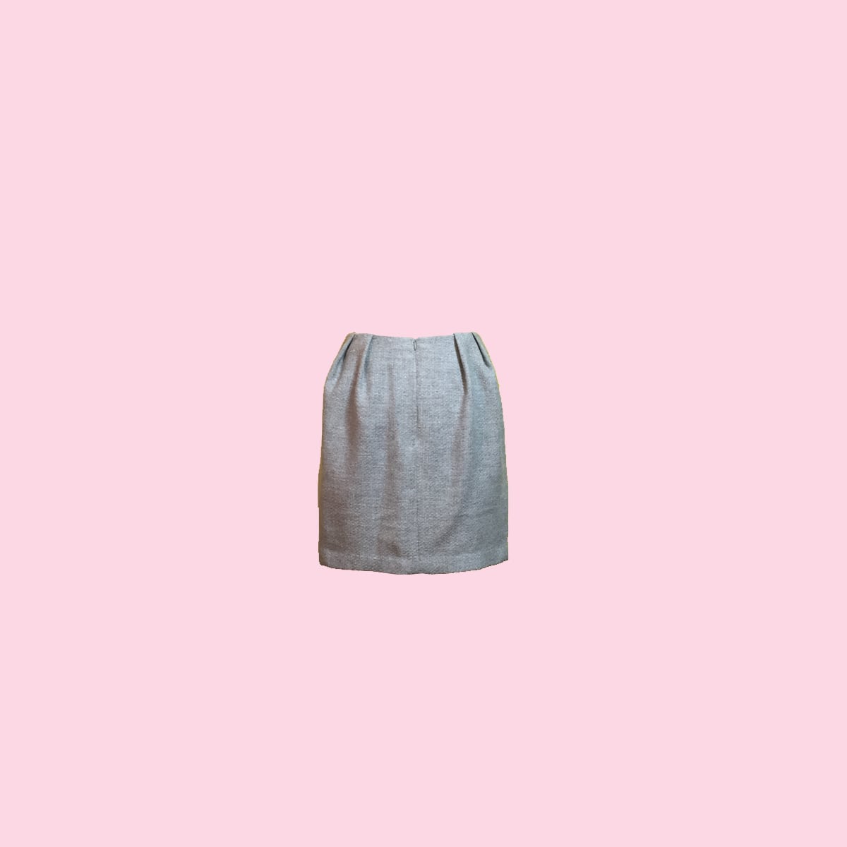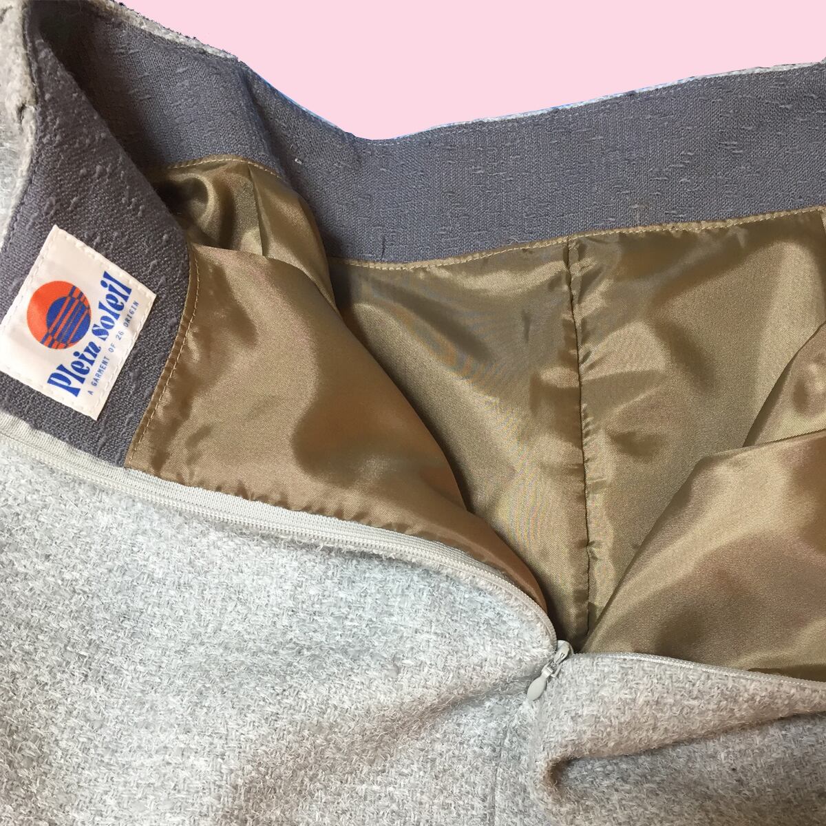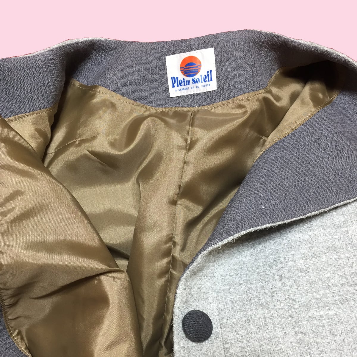 レトロなノースリーブジャケットとタックスカートのアンサンブル。