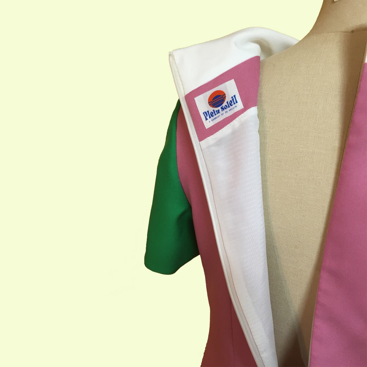ポリエステルのメイン素材の2色使い切り替えに、ボタン、パイピングのレッドがアクセントとなっています。