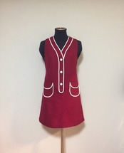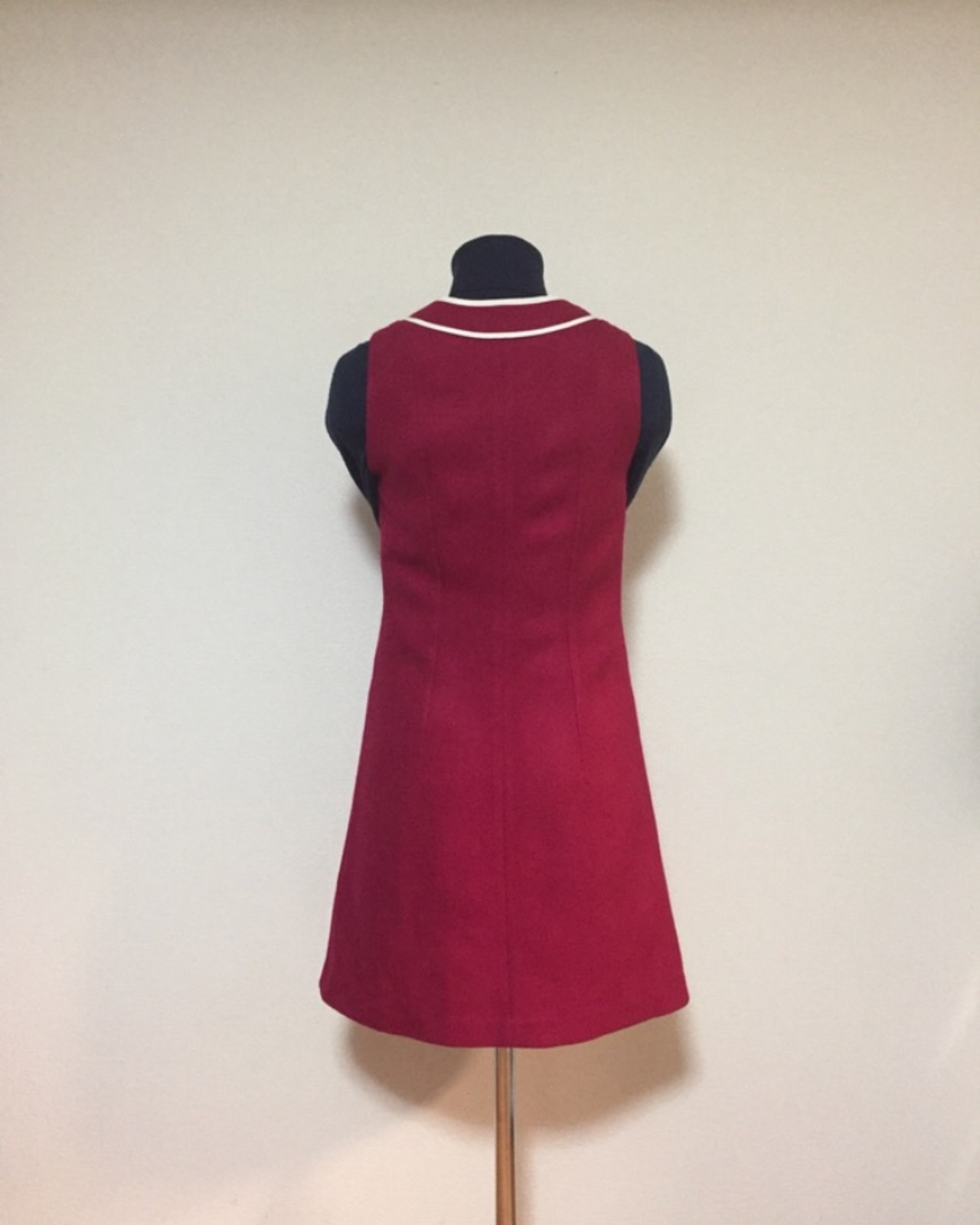 ボタン開きノースリーブ、配色パイピングが70sチックなデザインのソリッドカラーワンピースです。