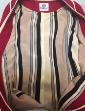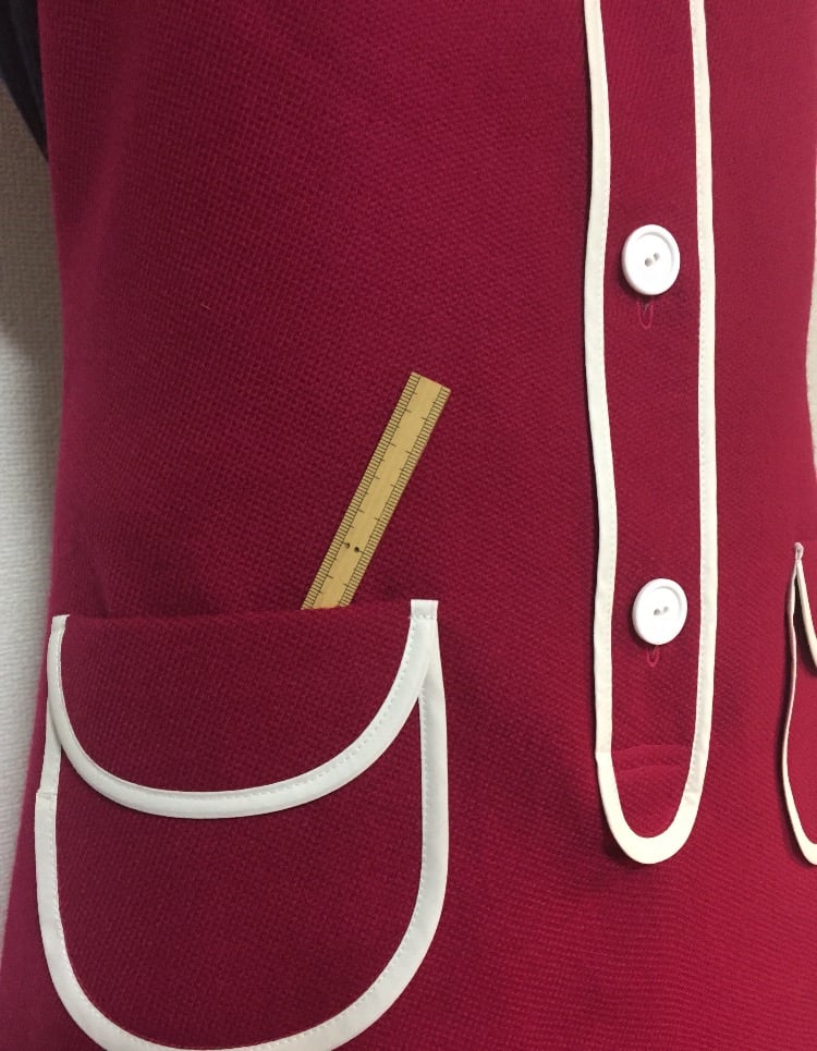 パイピングに合わせたボタンや、Aラインにしたことで、他商品よりもウエスト周りをややゆったりとさせたデザインにしました。