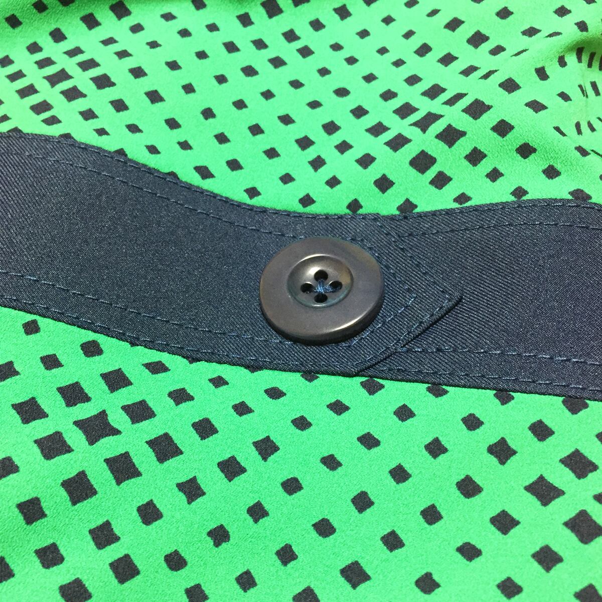 衿周りのタック、ウエストマークのベルト&大ぶりのボタンがポイントになっております。
