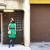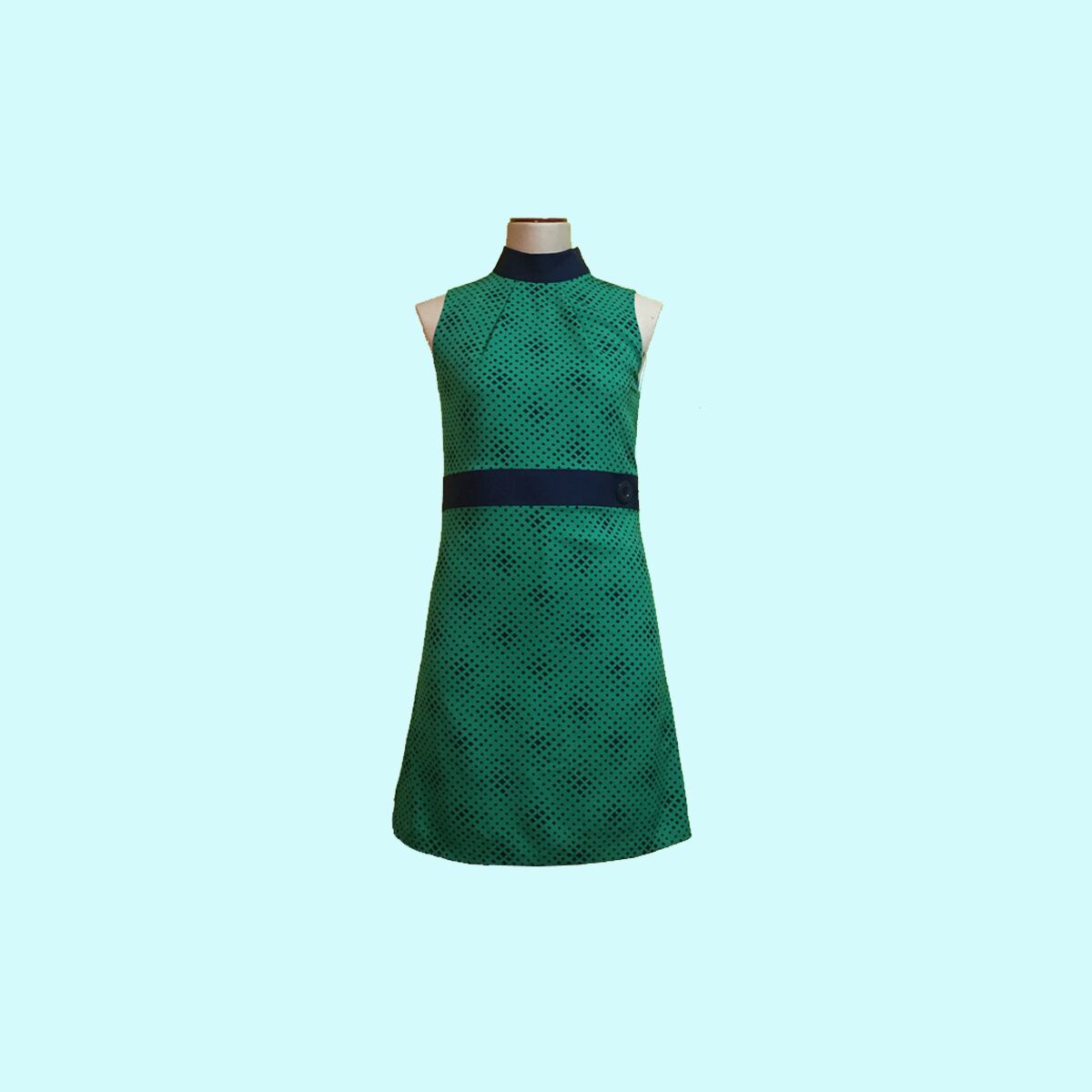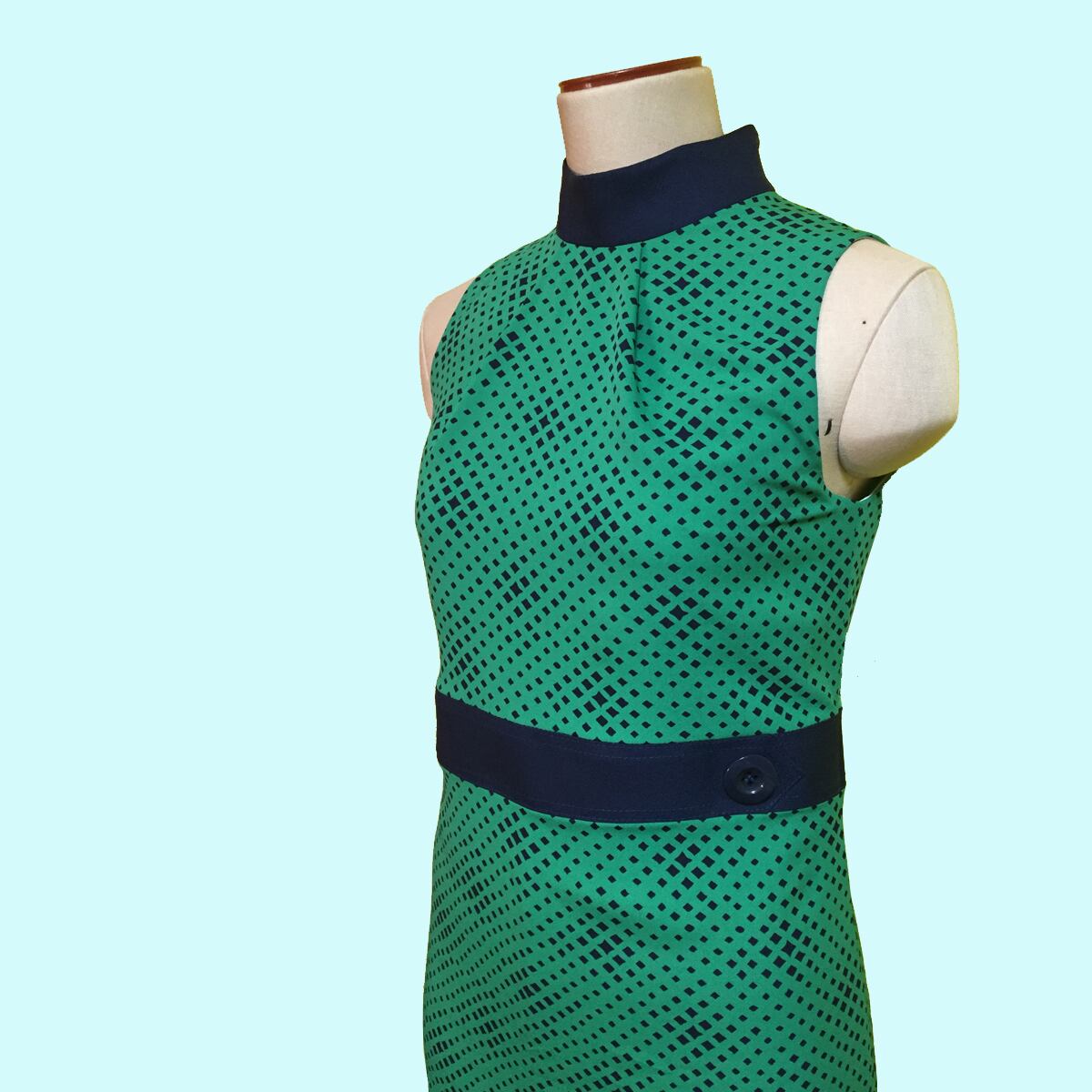 輸入生地を使用した後ろ開きハイネック、ベルト切り替えのワンピース。