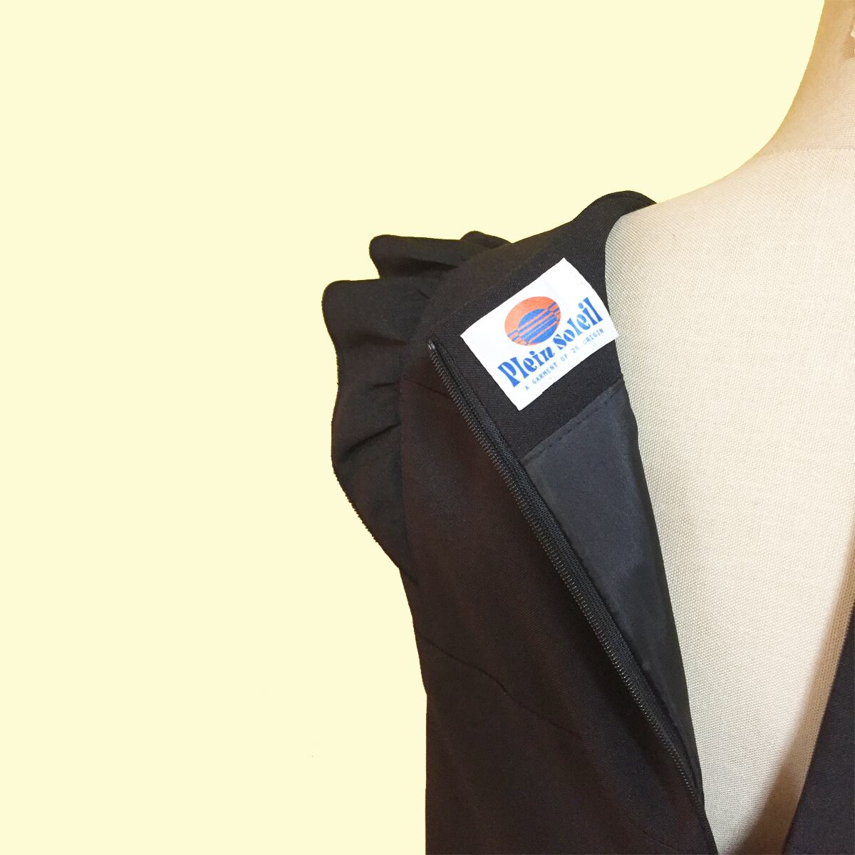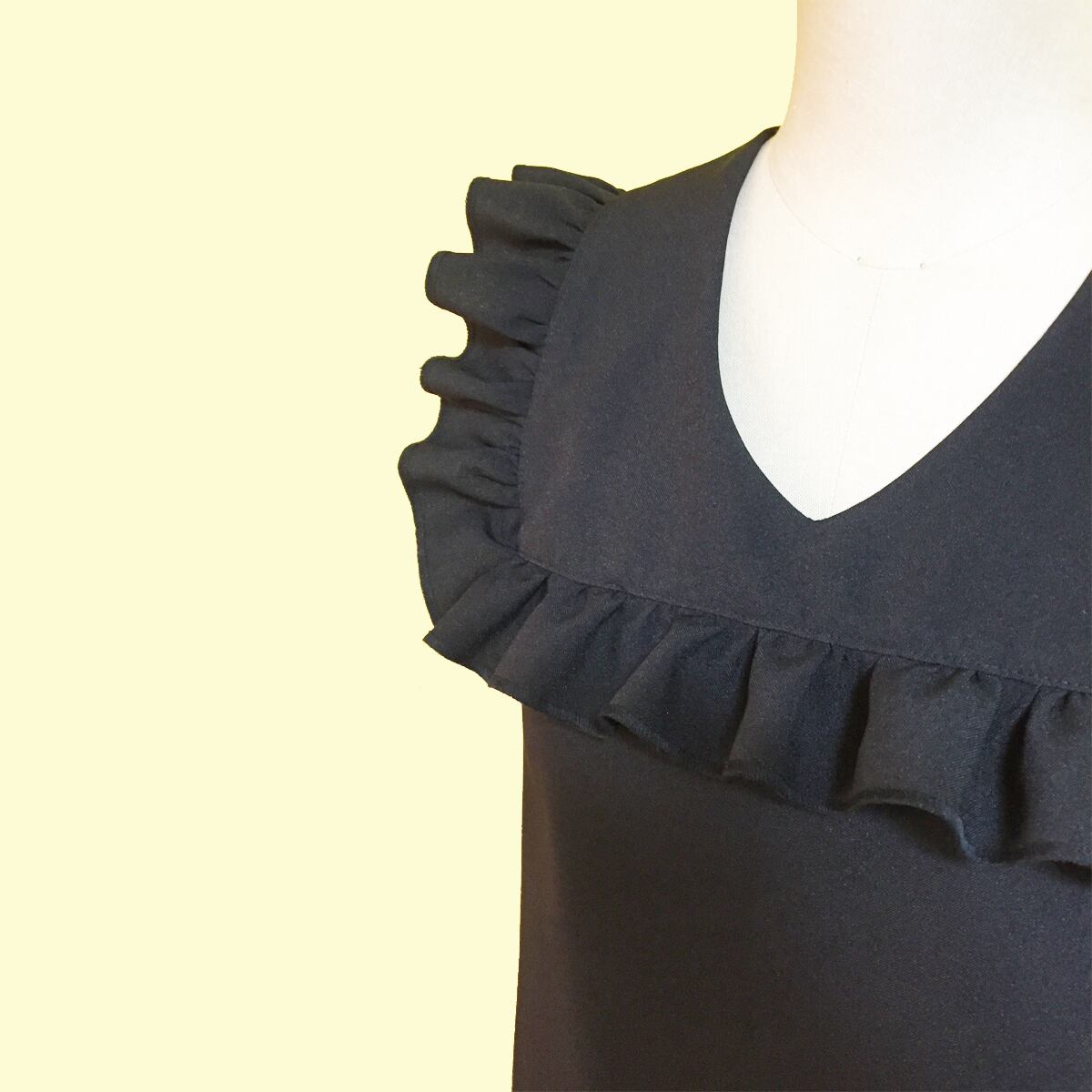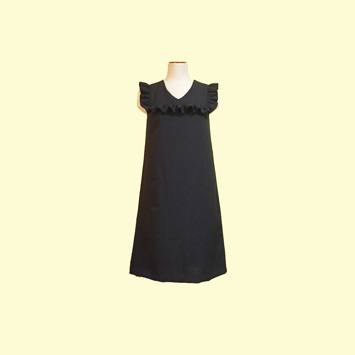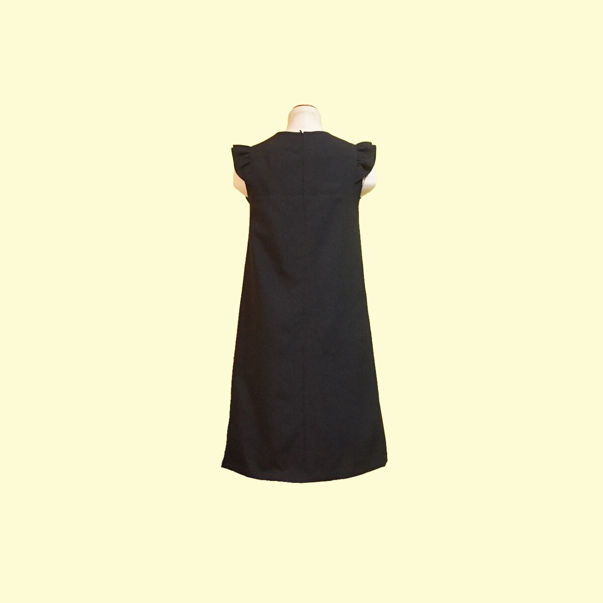 胸元〜肩のフリルがデザインポイント、シルエットはAラインになります。