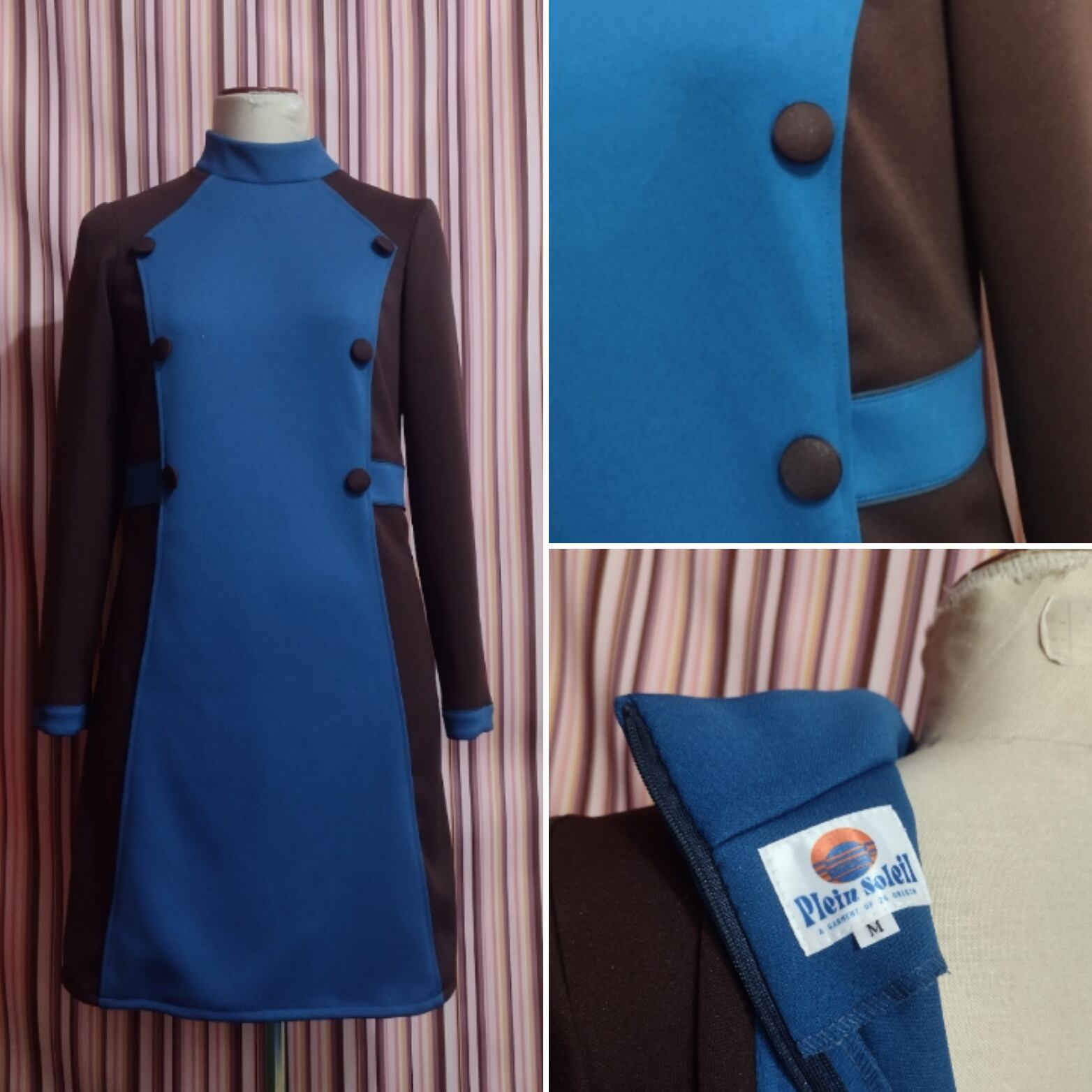 フロントの飾りボタンとベルト袖口のパイピングがデザインポイント。
