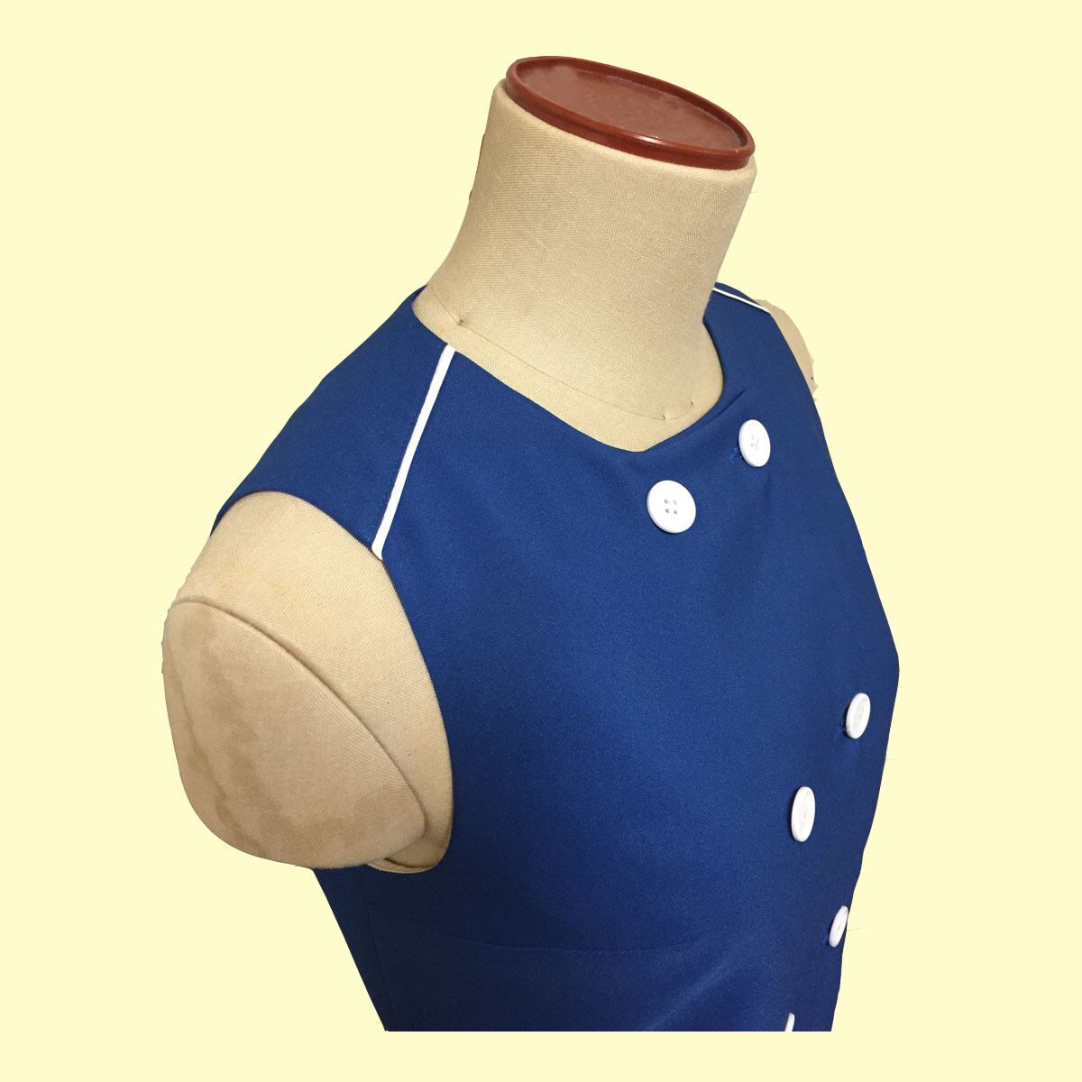 スモークブルーのメイン素材にホワイトのボタンと肩部分のパイピングがアクセントとなっています。