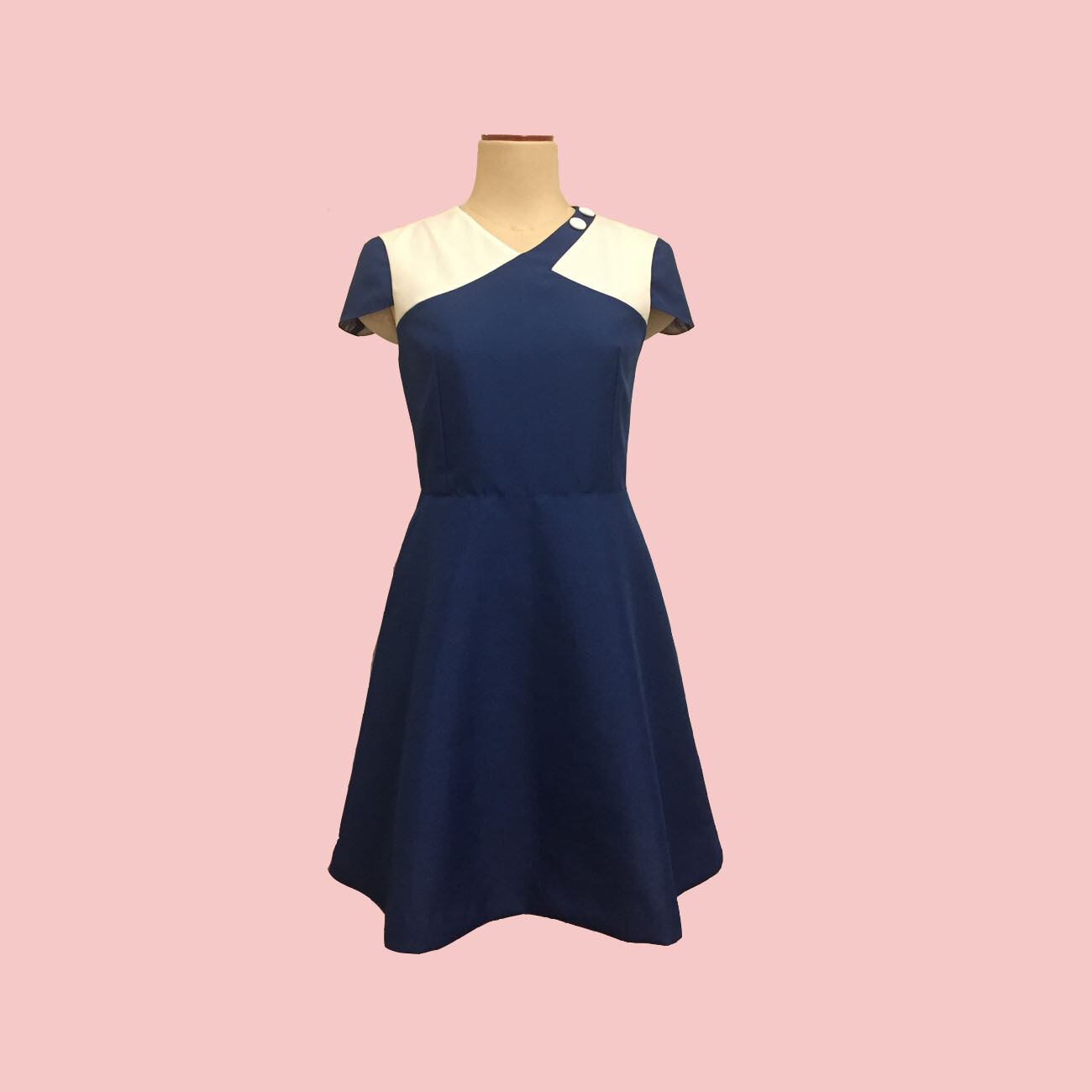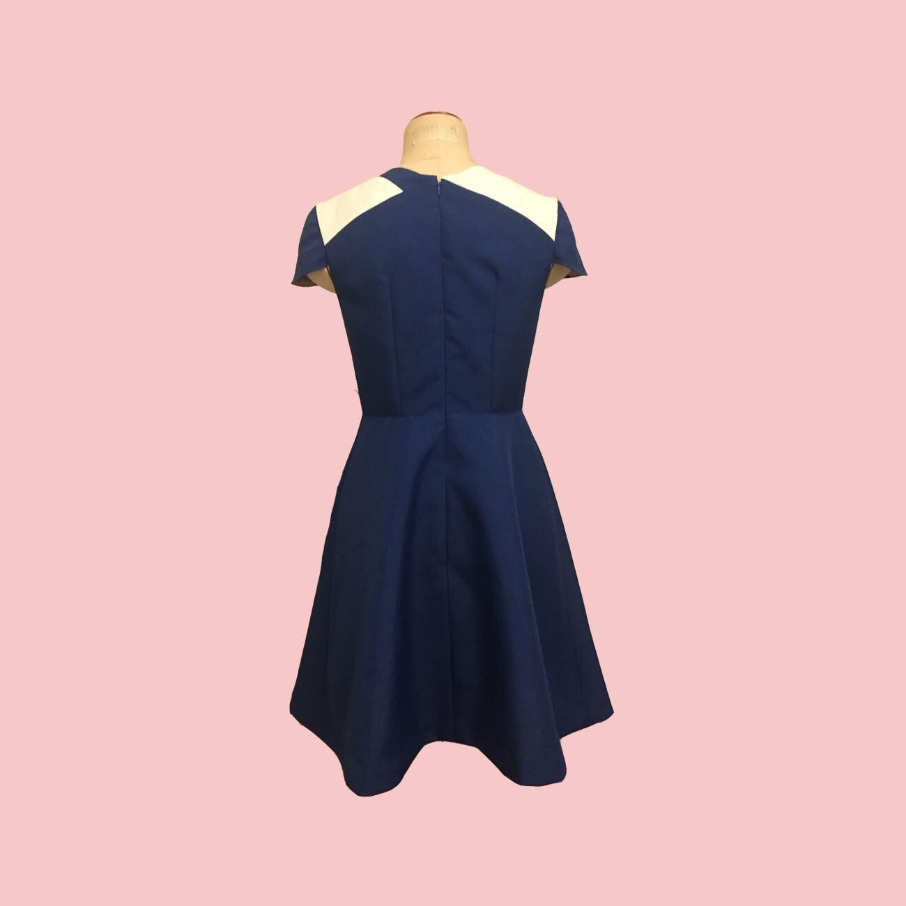 スカートのシルエットはフレア、袖はキャップスリーブなので、可動性はノースリーブ同等とディテールにこだわったアイテムです。
