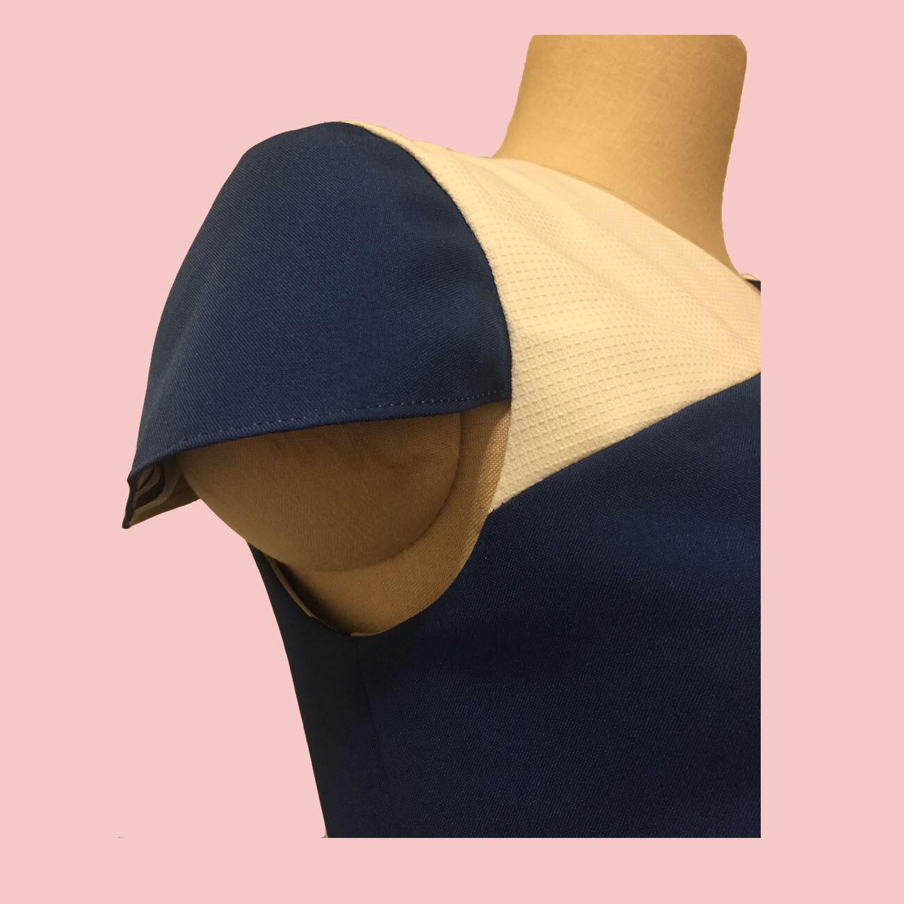 ポリエステルギャバジンのメイン素材にホワイトのワンショルダー風切り替えがアクセントとなっています。