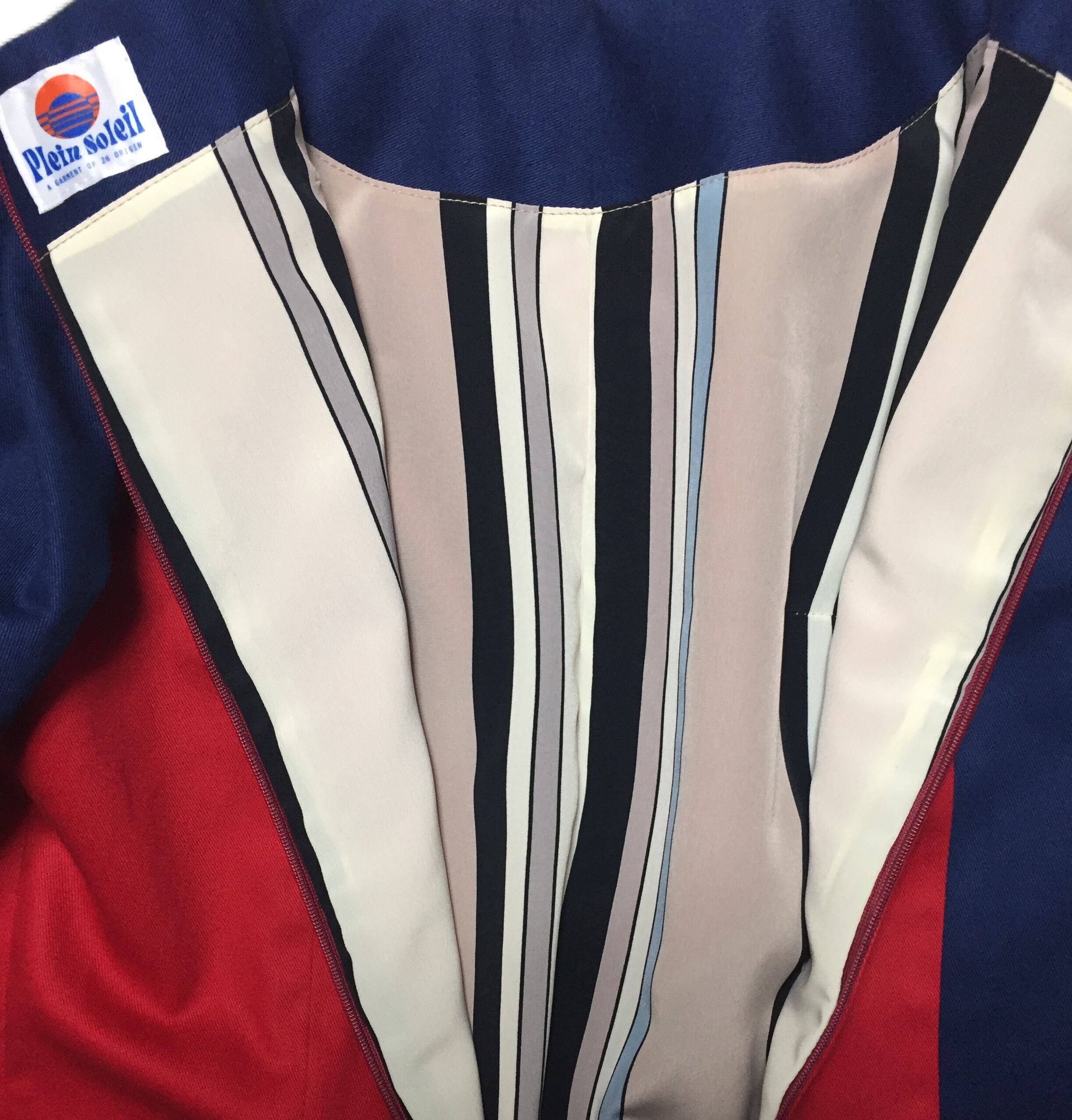コットンのメイン素材の2色使い切り替えに衿、ボタンのホワイトがアクセントとなっています。