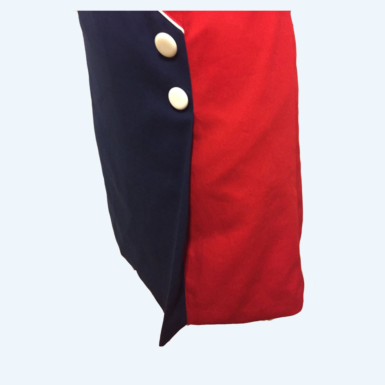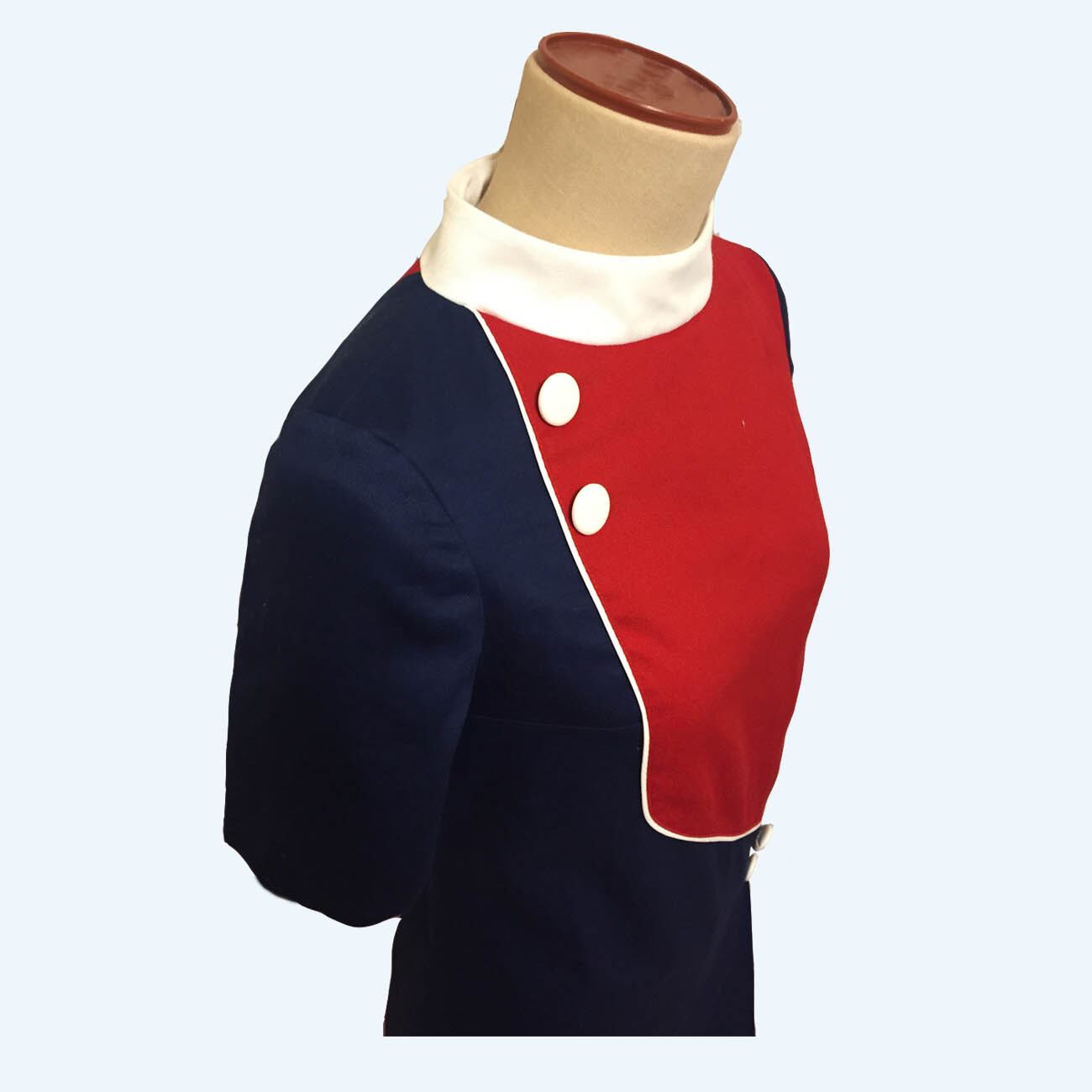 片側プリーツ入りスカート、ボートネックラインのハイネックもポイントとなっています。