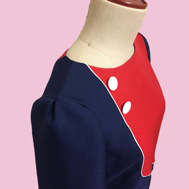片側プリーツ入りスカート、袖山のタック、ボートネックラインがポイントとなっています。