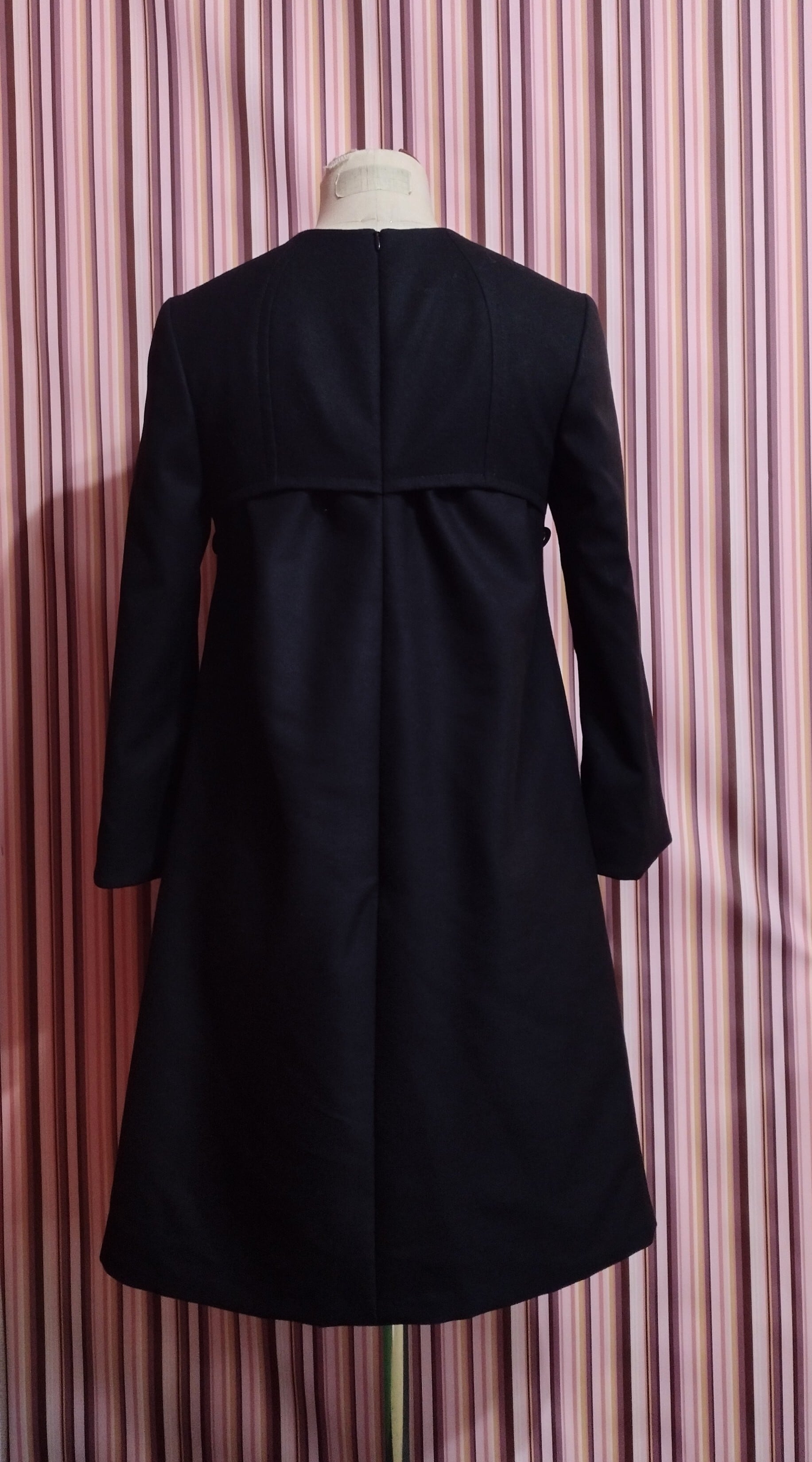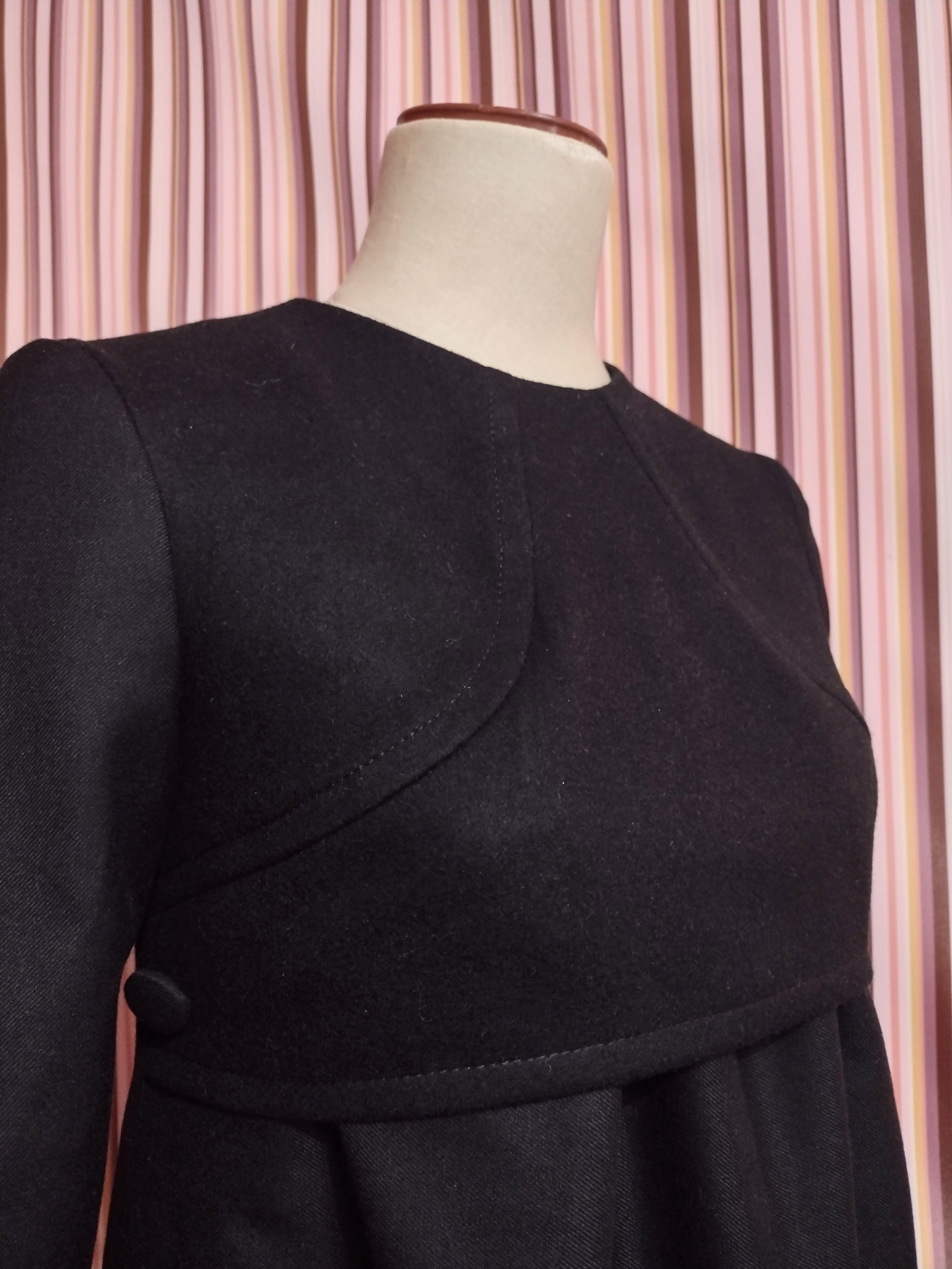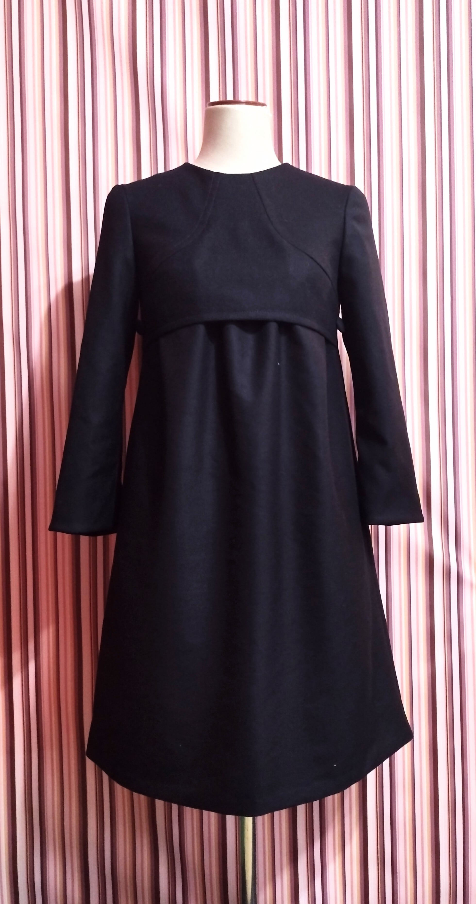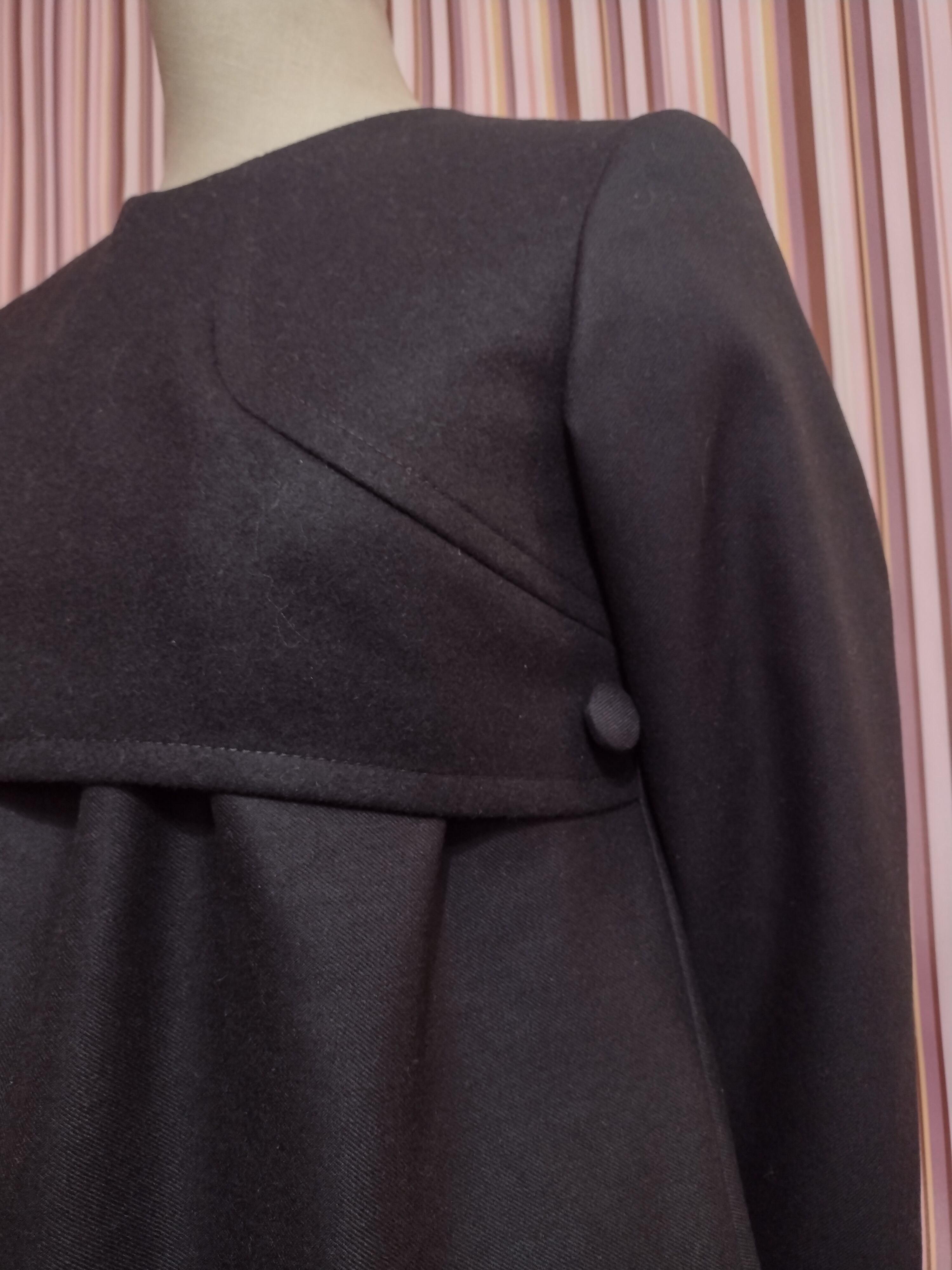 メルトンウールとフラノウールの素材切り替えのハイウエストシルエットデザイン。