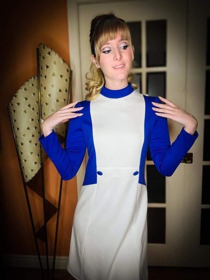 後ろ開きロングスリーブ、60sチックな大胆なカラーブロックデザインの袖付きハイネックワンピースになります。