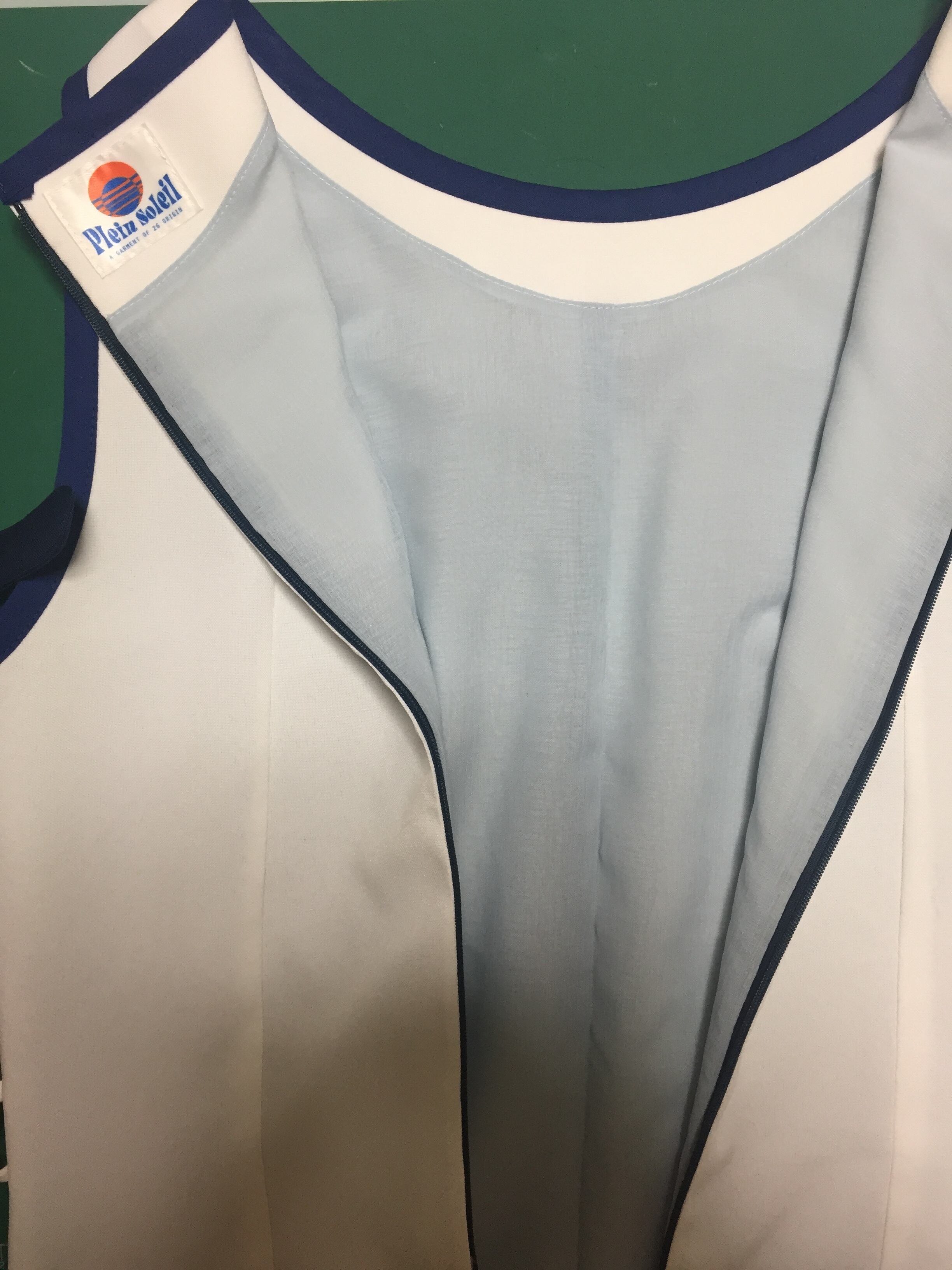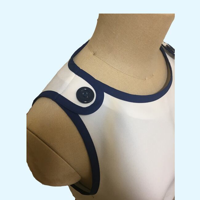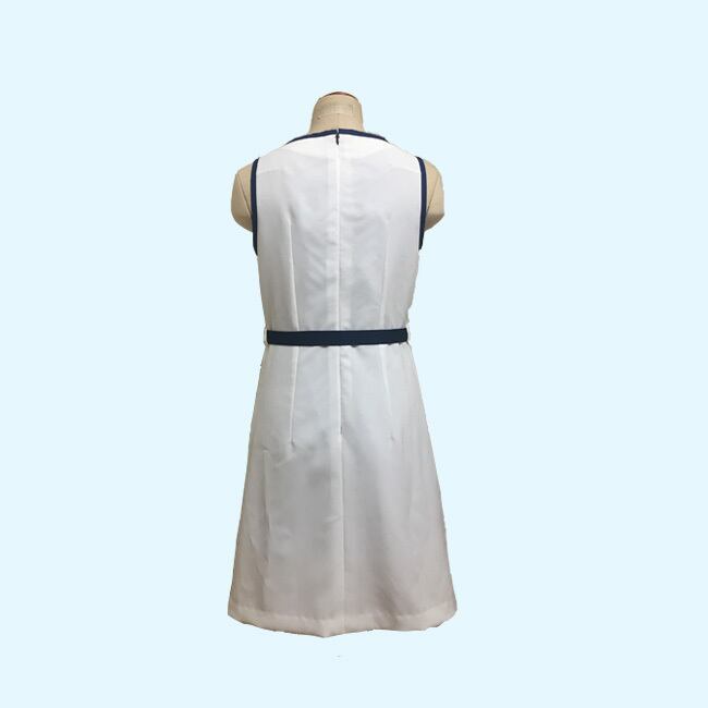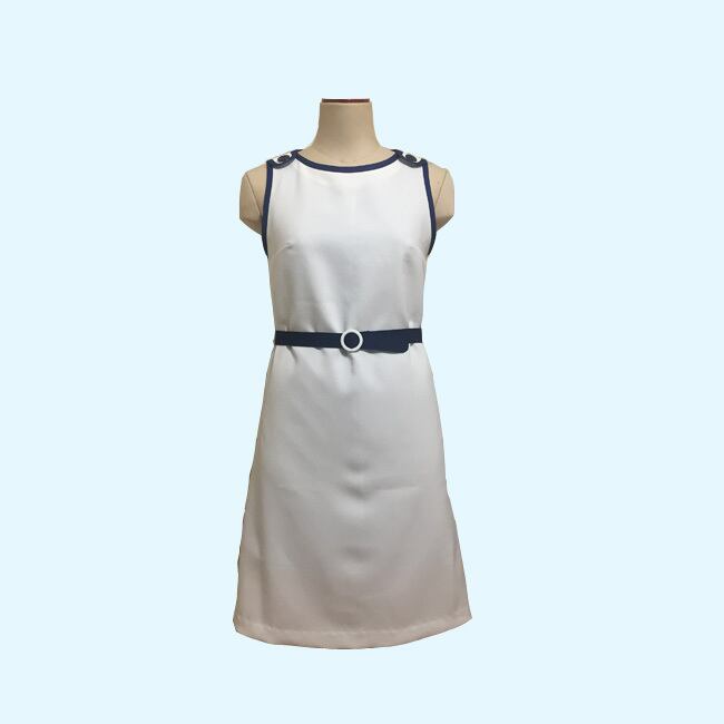 オフホワイトのメイン素材にネイビーのパイピング、ボタン、ベルトがアクセントとなっています。