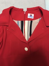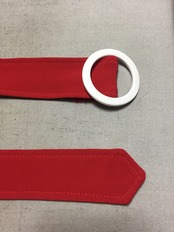 赤に映えるホワイトのボタン、バックルがポイントです。