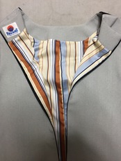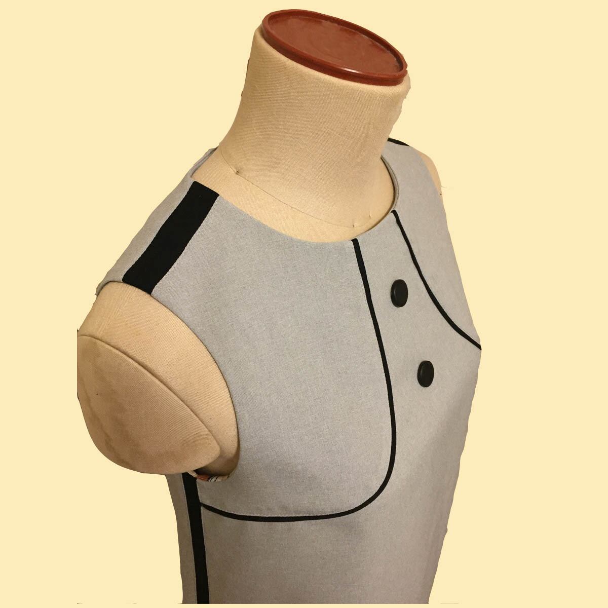 ライトグレーのメイン素材にブラックオックスフォードの脇、肩切り替え、胸パイピングがアクセントとなっています。