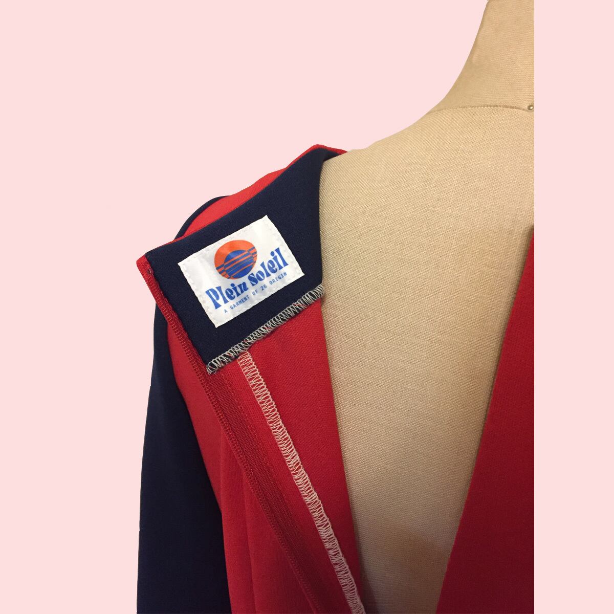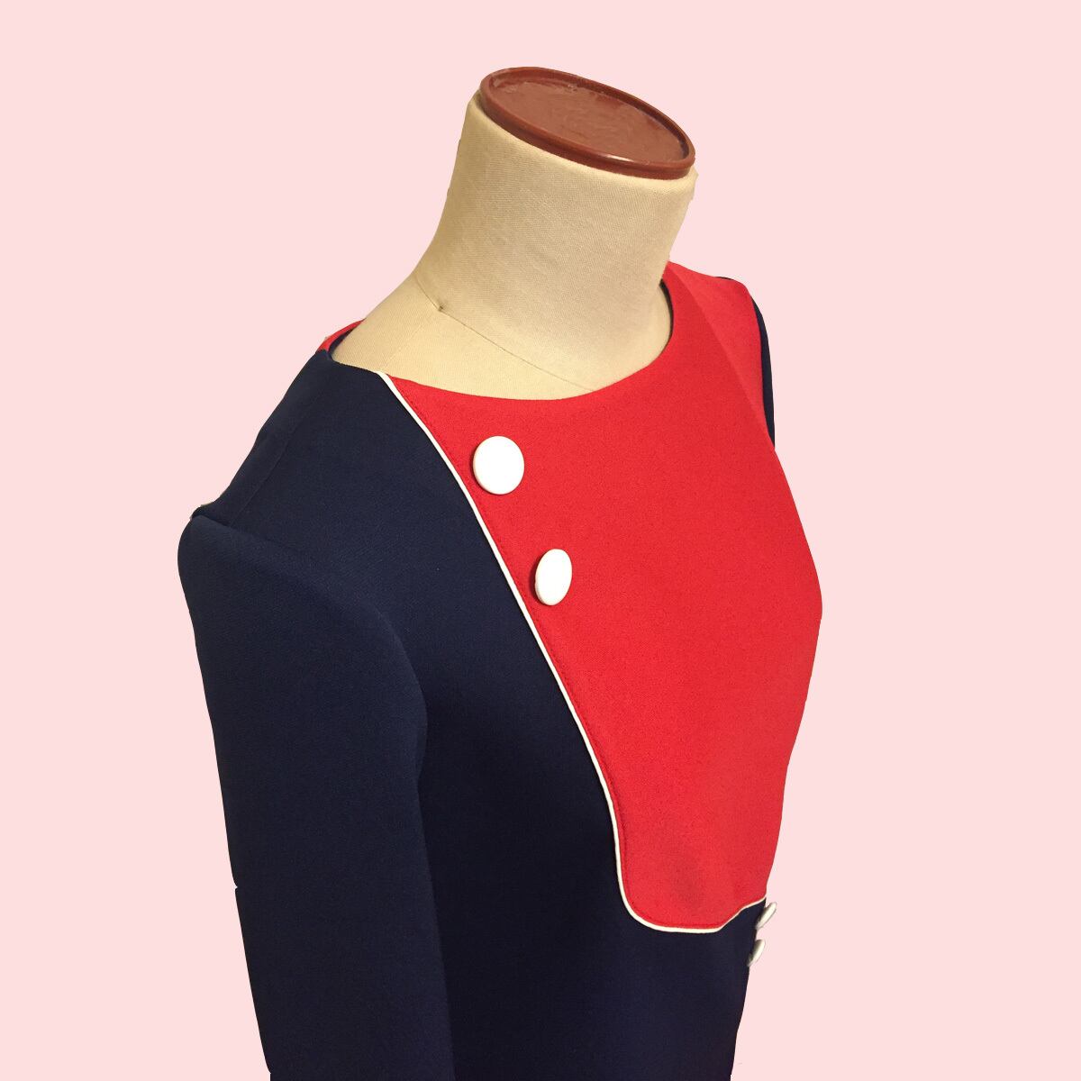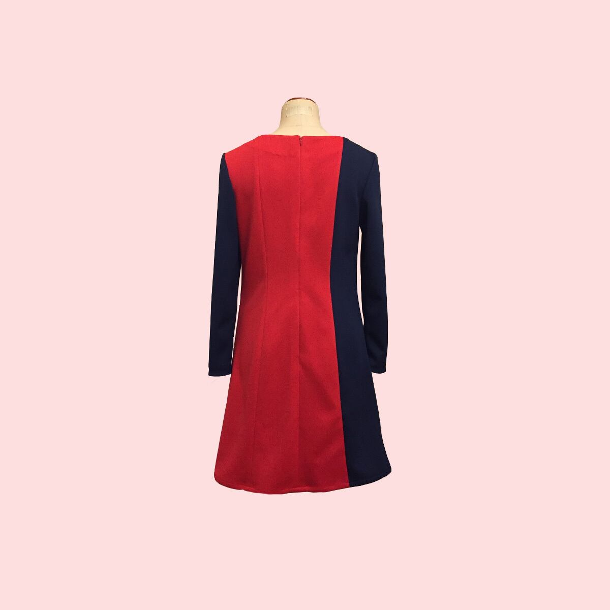 後ろ開きロングスリーブ、60sチックなアシンメトリーデザインのワンピース。
