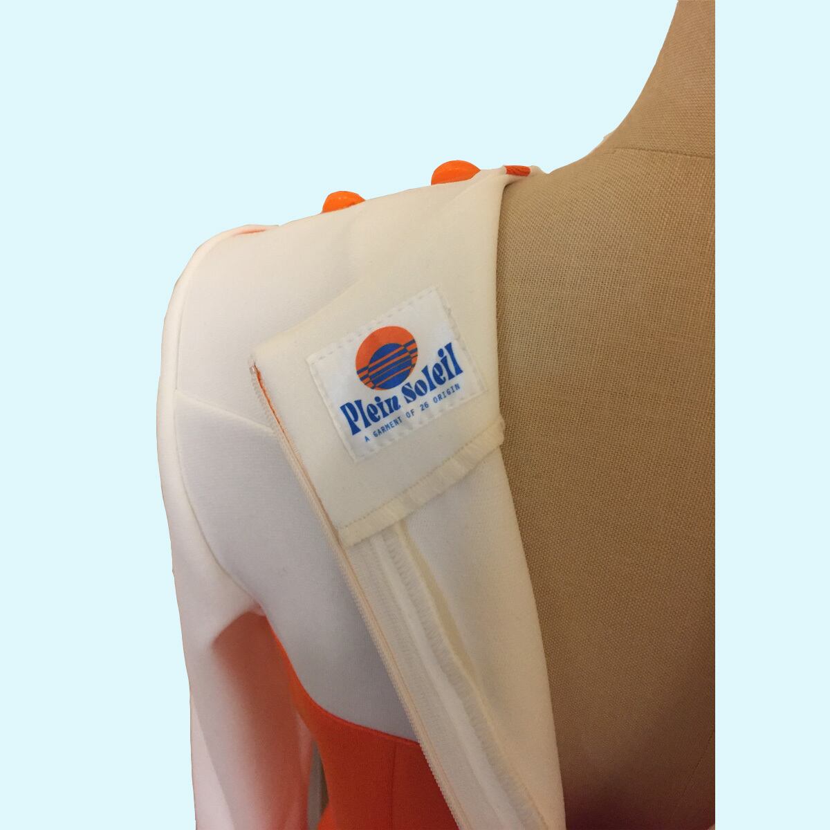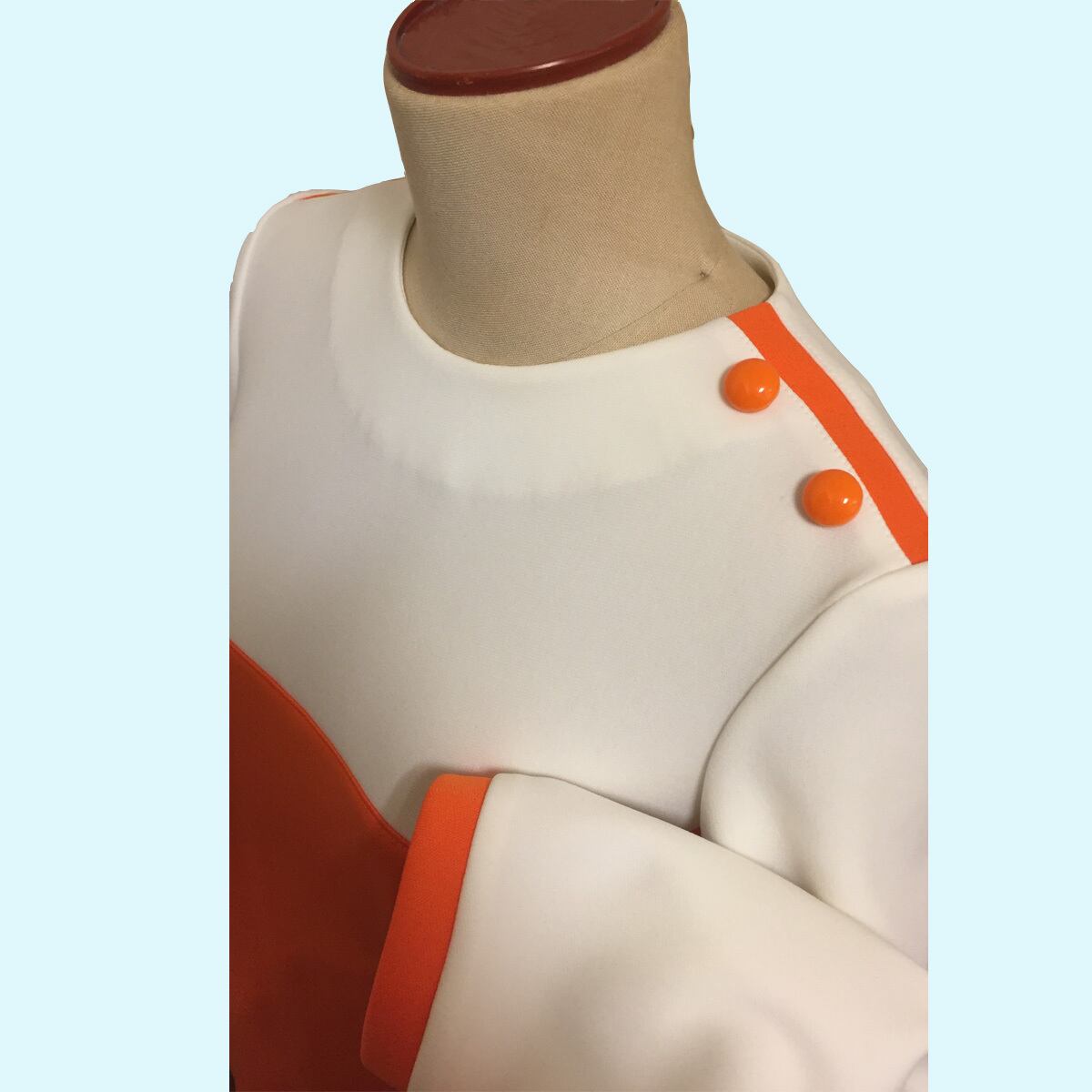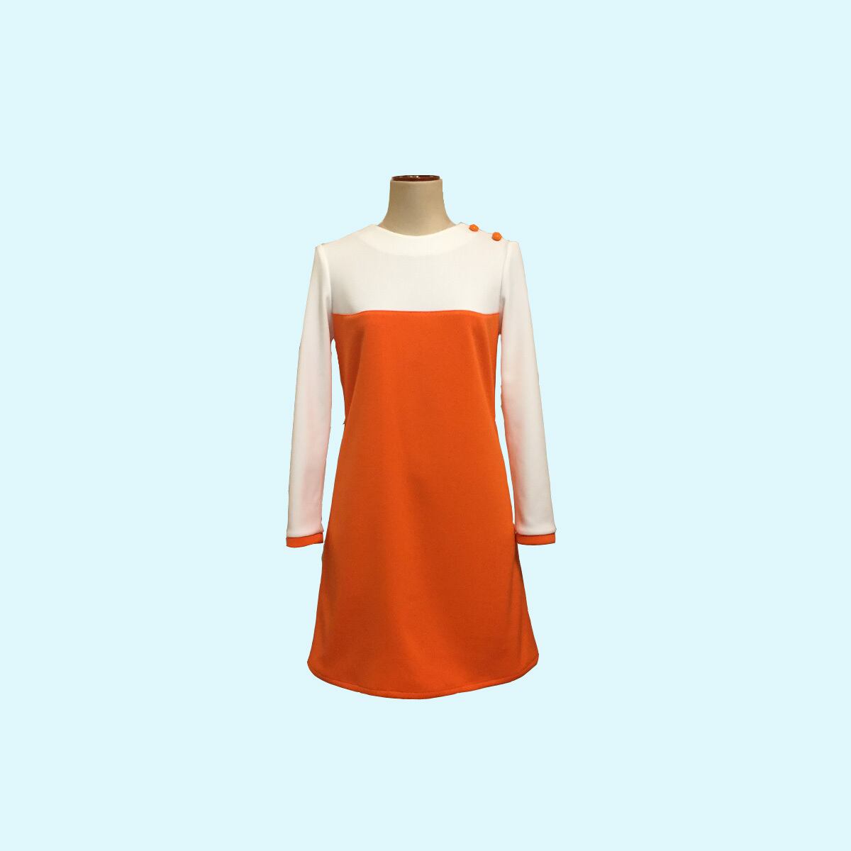 後ろ開きロングスリーブ、60sチックな大胆なカラーブロックデザインの袖付きワンピースになります。