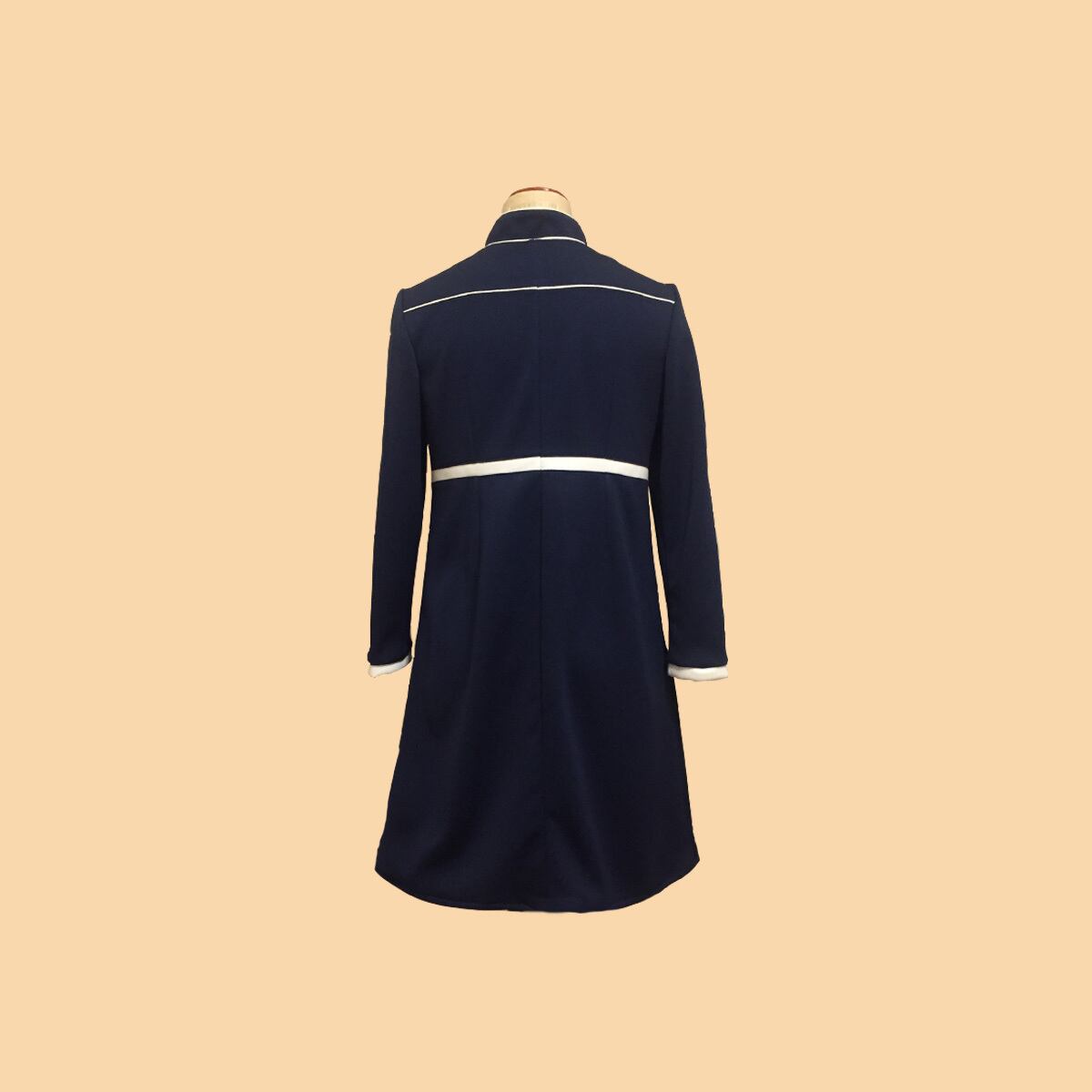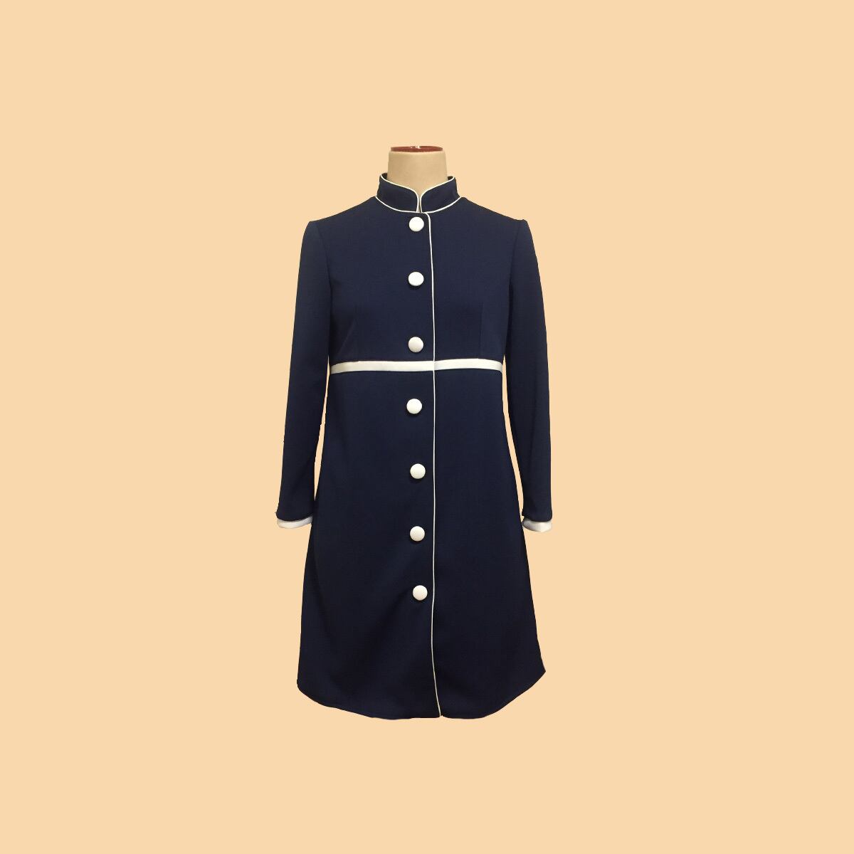 前開きロングスリーブ、ハイウエスト切り替えデザインの袖付きスタンドカラーワンピースになります。