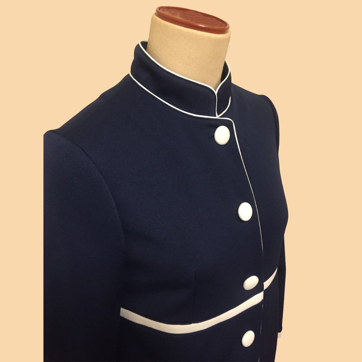 ハイウエストでのベルト配色切り替え、カラースイッチボタン、また袖口、パイピングの配色使いがポイントです。