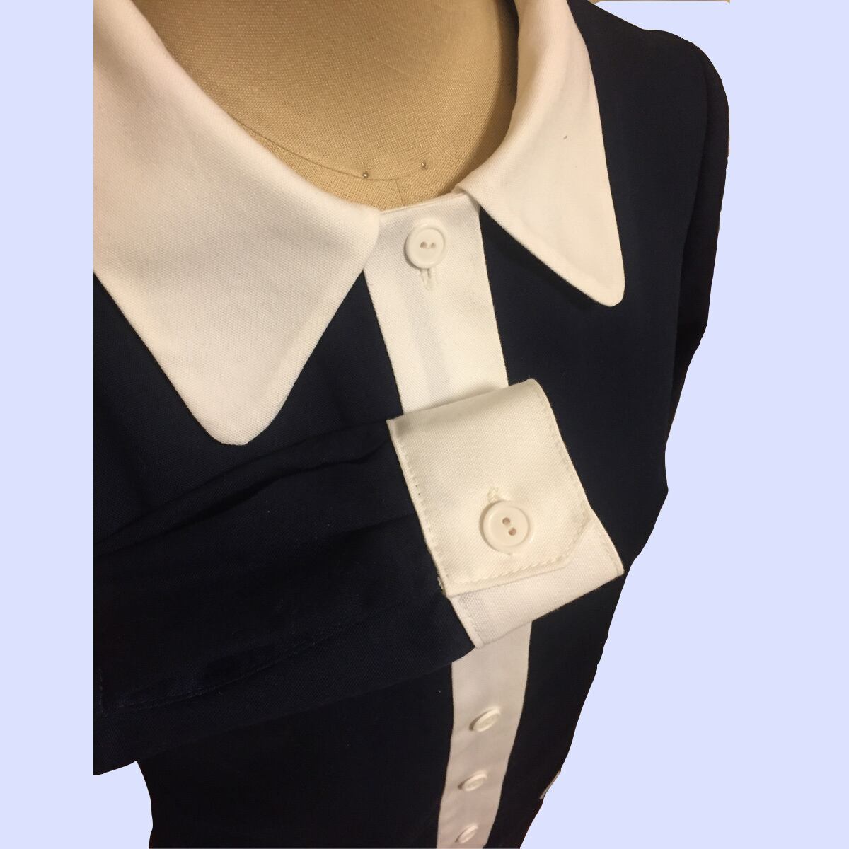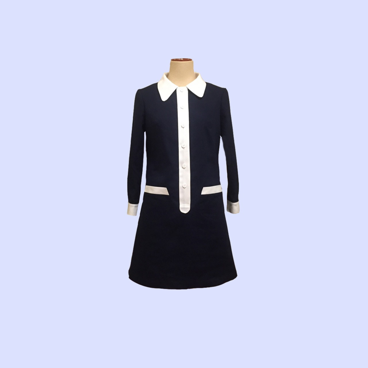 大きめの衿、配色カフスが60sチックなデザインのワンピースです。
