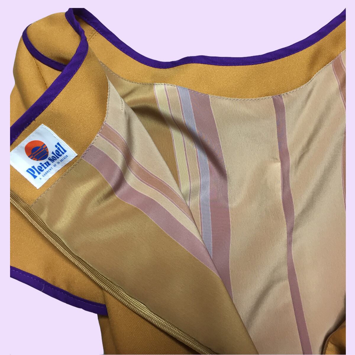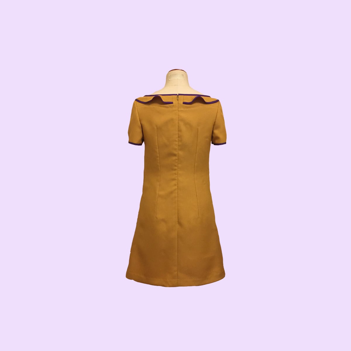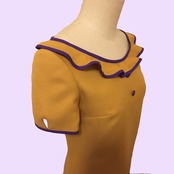 マスタードに映えるパープルのトリミング、ボタンがポイントです。